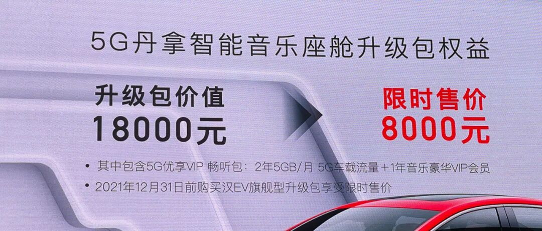 本次“5G丹拿智能音乐座舱升级包”的售价为1.8万元,在12月31日前购买汉EV旗舰型,此升级包的售价则为8000元。