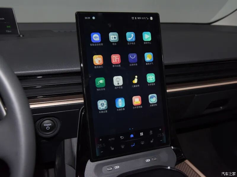 中央的纵置悬浮式屏幕集成了绝大部分功能,在线地图、第三方音乐、后视镜调节、后备厢开闭等功能均有配备,此外空调控制功能集成在屏幕下方,呈常显示状态,便于行车时操作。