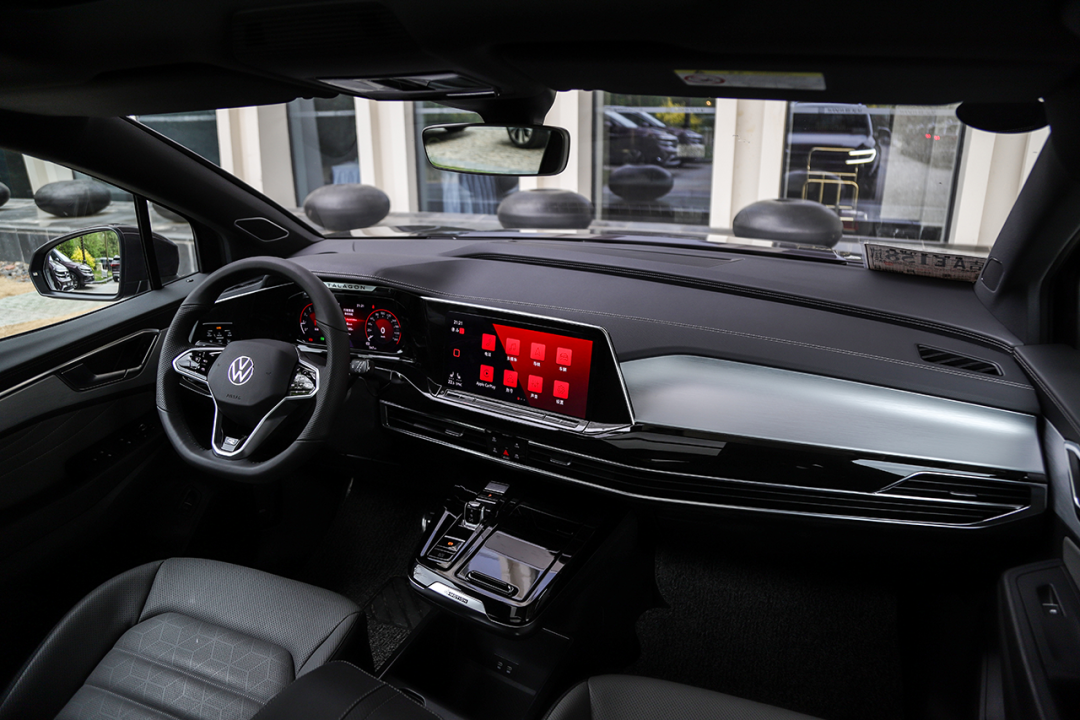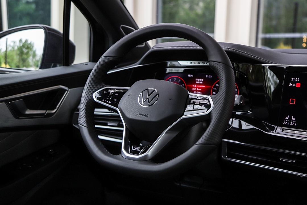 内饰用料的表现更好,中控台上方使用了更柔软的皮质材料包裹覆盖,而非以往大众车型惯用的搪塑材料,这是旗舰车型应有的态度。R-Line的方向盘造型运动,握感出色,手感真好。方向盘左右两侧按键均为触摸的操作形式,按键的响应速度很快,且加入了振动反馈。