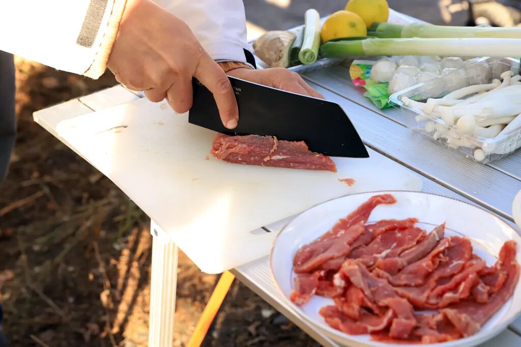 腾势X自带了取电插座,把插座接在慢充口上,另一端接上电器,反向供电就会自动开启,把功率开到最高档,等待锅底沸腾的过程中,把牛肉切片。