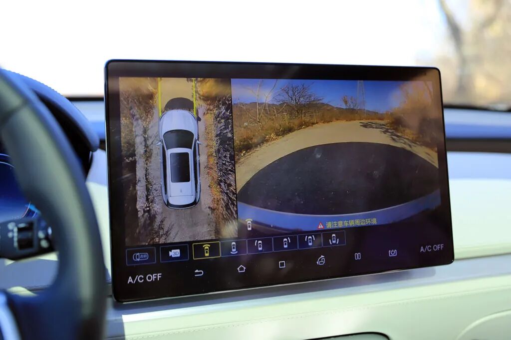 通往百花山深处的山路越走狭窄,道路一侧就是悬崖,再加上这样的道路不容易得到养护,周围杂草树枝丛生,这个时候,腾势X的360°全景影像就发挥了作用,高清的全景影像让心里顿时生出很多安全感。