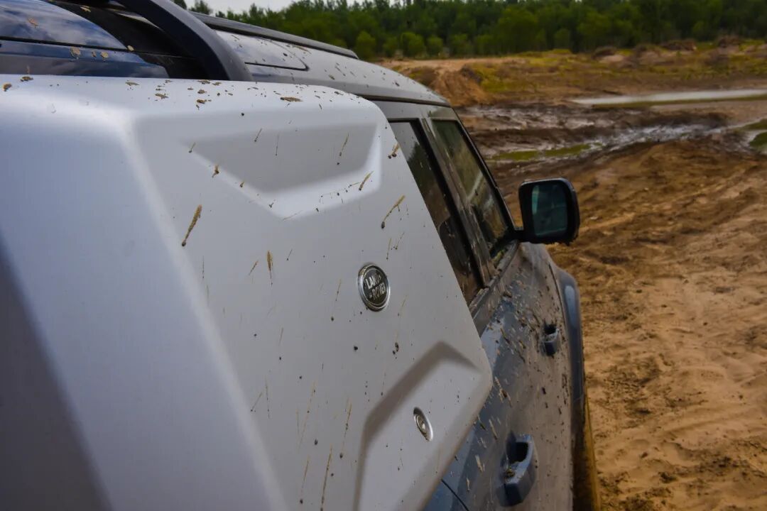 全新卫士的限滑装置都可以自动断开/锁止,当然你也可以通过越野模式中的自定义来手动锁止,它还带有低速四驱,扭矩可放大2.93倍。在刚刚下过雨的泥泞腹地,你只需要稍微给一点油,即可脱困,甚至都没有出现轮胎空转的情况。