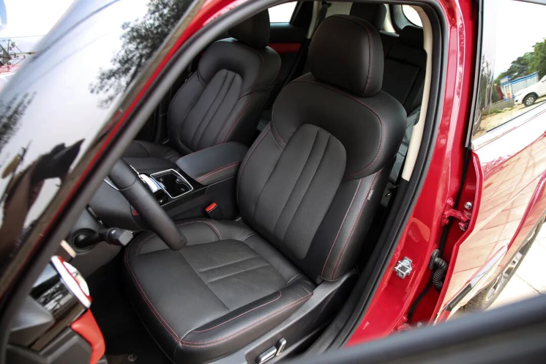 造型比较宽大的座椅采用真皮材质包裹,红色缝线的加入使座椅与车内环境相融合。前排座椅具有加热/通风功能,主驾驶座椅采用电动调节而且还有三组记忆位置。身高173cm体验者坐前排,座椅调最低且驾驶位置调合适之后,头部空间1拳。