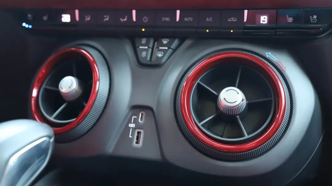 你能在这台车内找到不少的圆形元素,仪表盘内采用液晶屏+机械仪表的双重搭配,既能满足年轻人对于科技感的追求,视觉上也非常直观;中控区域下方的两个出风口造型摩登,尺寸巨大,旋转红色的外圈即可调整温度,上方我们还能见到座椅通风的功能,在高温超过40度的阿拉善,可是绝对的降暑神器。