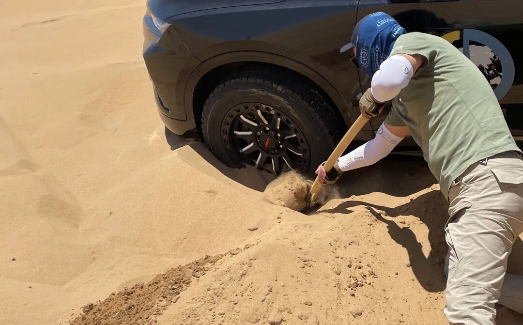 对于不少刚接触沙漠穿越的朋友来说,陷车恐怕是家常便饭,不过需要注意的是,陷车之后千万不要盲目加油脱困,反而会让轮胎越陷越深。此时可以尝试挂倒挡并更换路线,不行的话也可以直接挖沙,当然如果有救援车辆或者路过的热心同行帮忙拉一把那肯定是再好不过了。