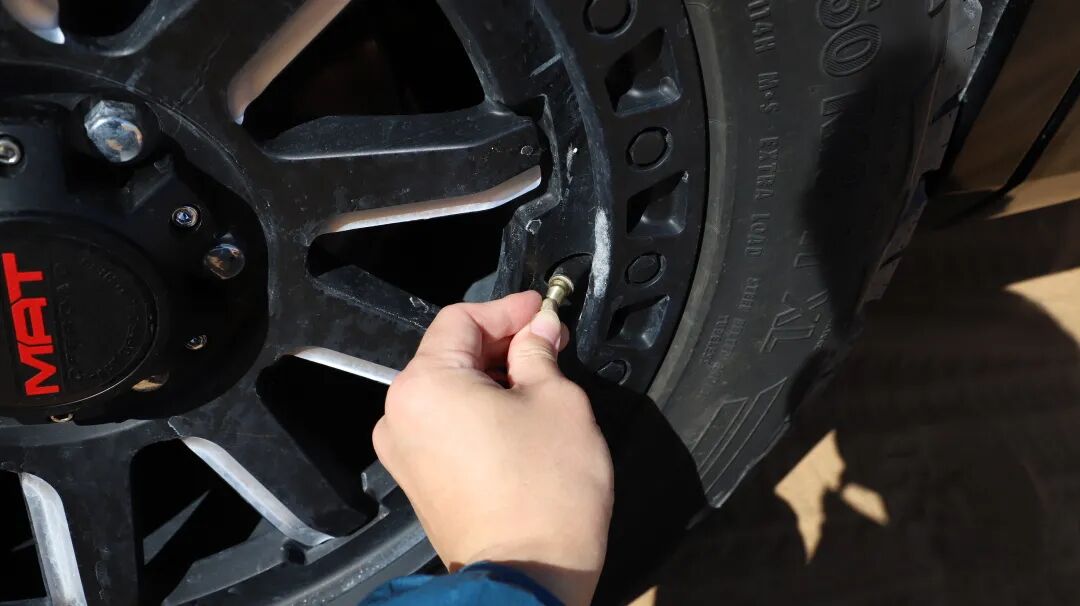 下到非铺装路面之后,我们先对轮胎进行放气,较低的胎压可以让胎面与沙地有更大的接触面积,从而带来更好的牵引效果。这时只需一块细小且尖锐的石块即可完成操作,四个轮胎胎压降低至120kPa左右就够了。