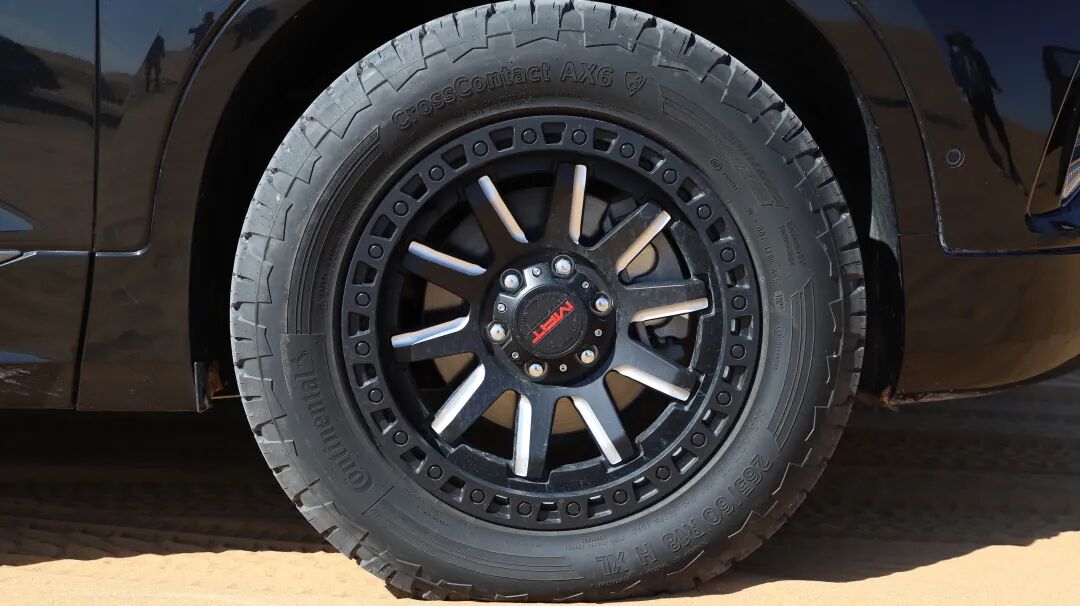 前往腾格里沙漠的途中,我们要经过柏油路、砂石路以及积水不断的泥泞道路,AT胎自然是适应多种路况的首选,车型选用了马牌CrossContact AX6的全地形轮胎,在公路行驶时的胎噪表现也没有想象中的那么大。