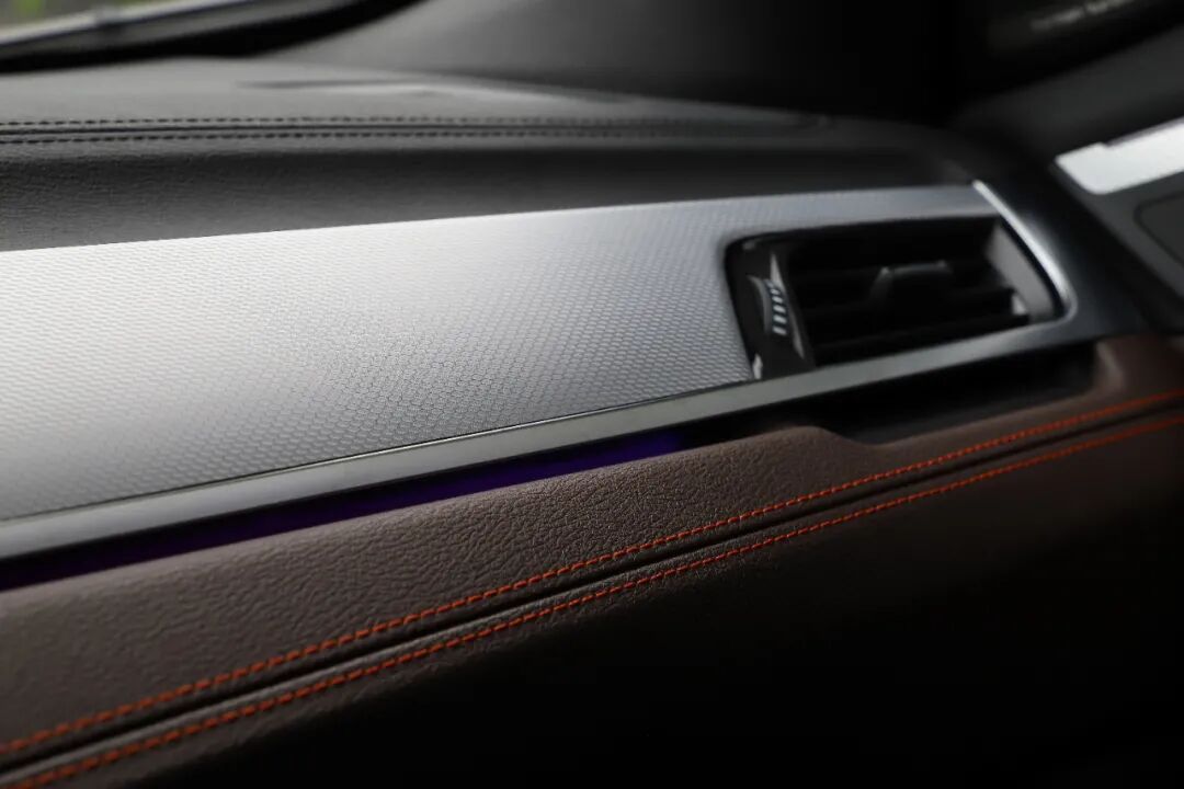 用料方面完全不用担心,中控台上半部分运用了大面积的真皮材质,下半部分还运用了缝线工艺,中间被银色饰板区隔开来,可远观更可近距离亵玩焉。