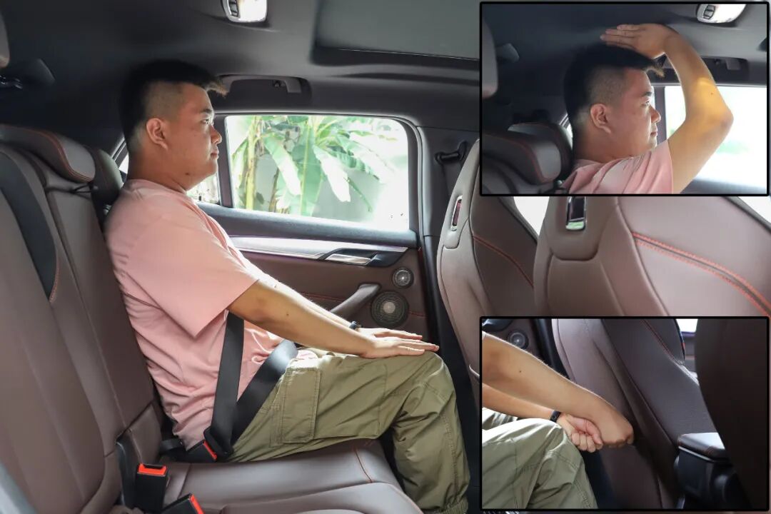 保持前排位置不变,同一体验者来到后排,此时头部空间为四指左右,略显局促。而腿部空间达到了两拳,对于这个级别的SUV车型来说,已经足够宽敞了。