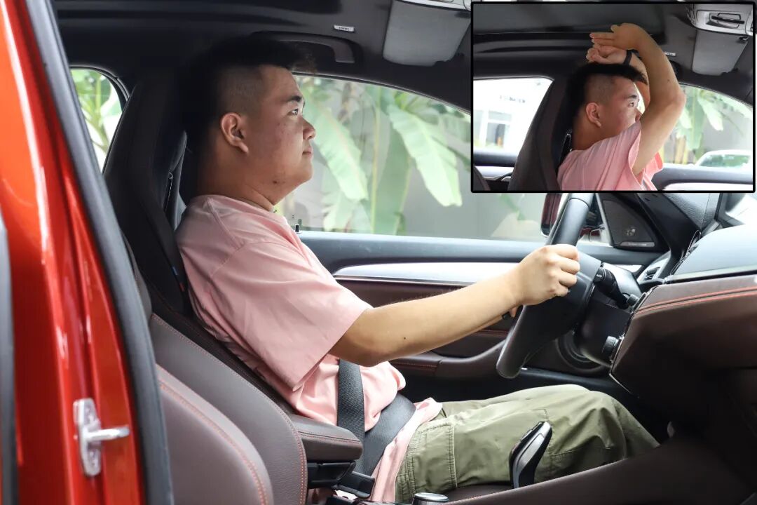 身高175cm的体验者进入前排,将座椅位置调至最低,此时头部的空间为一拳三指左右,没有什么压抑的感觉。