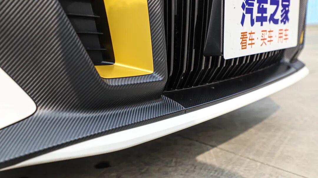 影豹的个性,在看到它的第一眼就难以忘却。如同机甲般的前脸就足够引人注目,黄色的涂装以及两侧的进气口装饰进一步刻画出中网的立体感,大面积的仿碳纤维纹路处理也是下足了功夫,仅从视觉效果看,性能感呼之欲出。