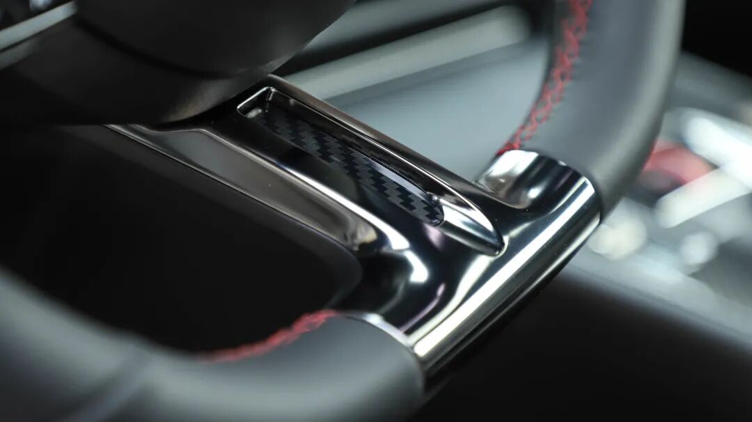 三辐式平底运动方向盘两侧采用打孔防滑设计,本次拍摄的高配车型采用的是真皮包裹,并配备有换挡拨片,盘辐上方的红色回正线很有竞速感。