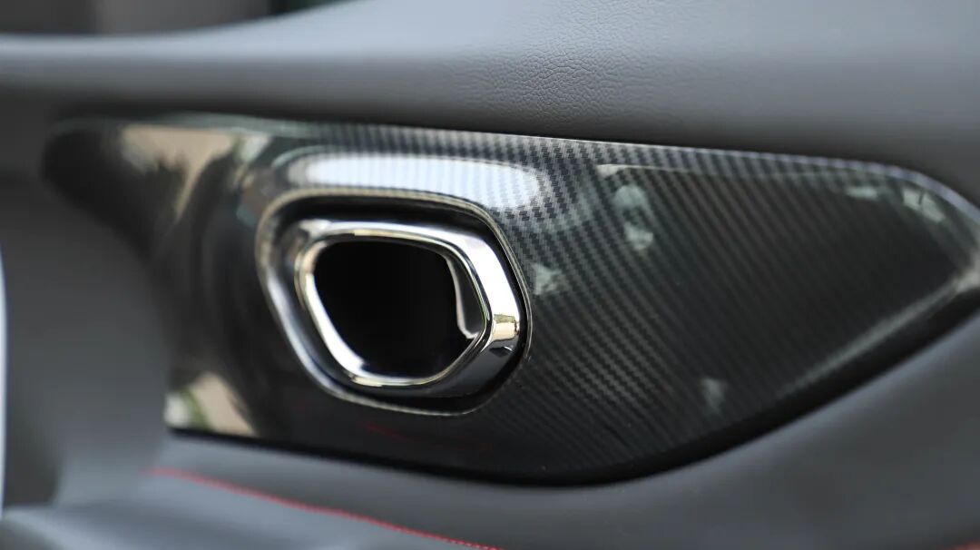 与外观类似,影豹的中央通道处以及两侧门板的拉手处大面积采用了仿碳纤维纹路的处理,视觉效果相当到位。