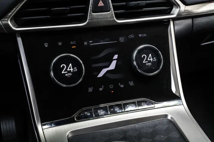 空调面板为触控式,搭配左右两侧带有小屏幕的旋钮,整体造型与路虎车型类似,在质感上没得挑。只不过盲操起来还是需要一定难度,不如直接语音控制来的快。