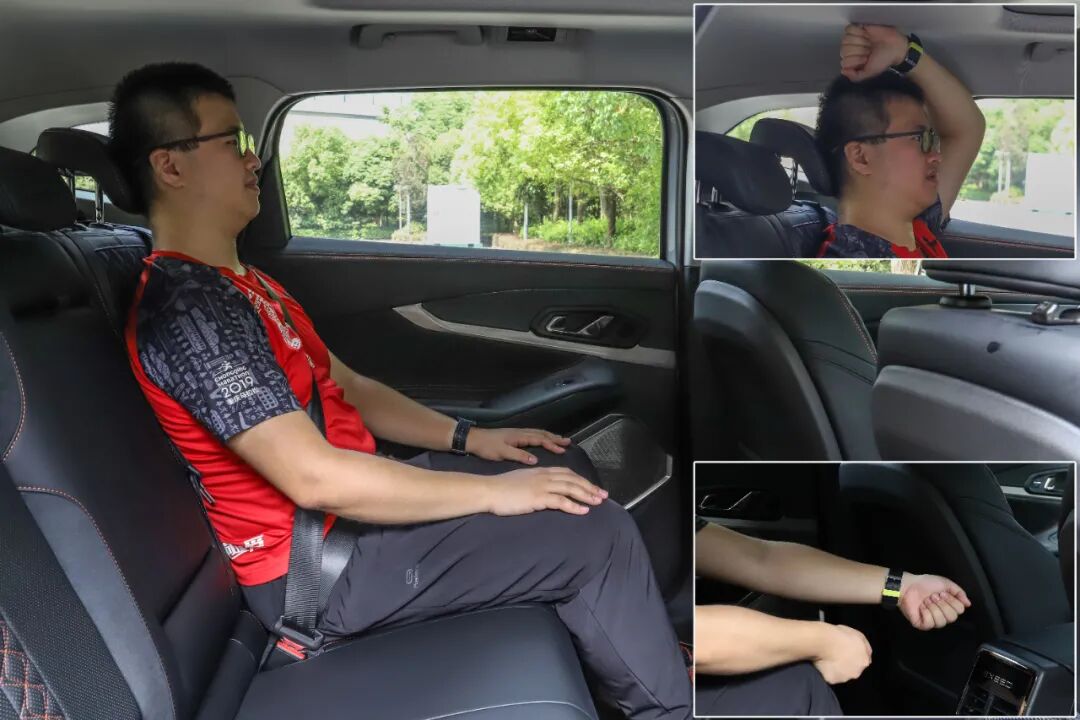 保持前排调整好的位置不变,同一体验者来到后排,此时的头部空间为一拳左右,腿部空间超过了两拳,在中型SUV中有着明显的优势。
