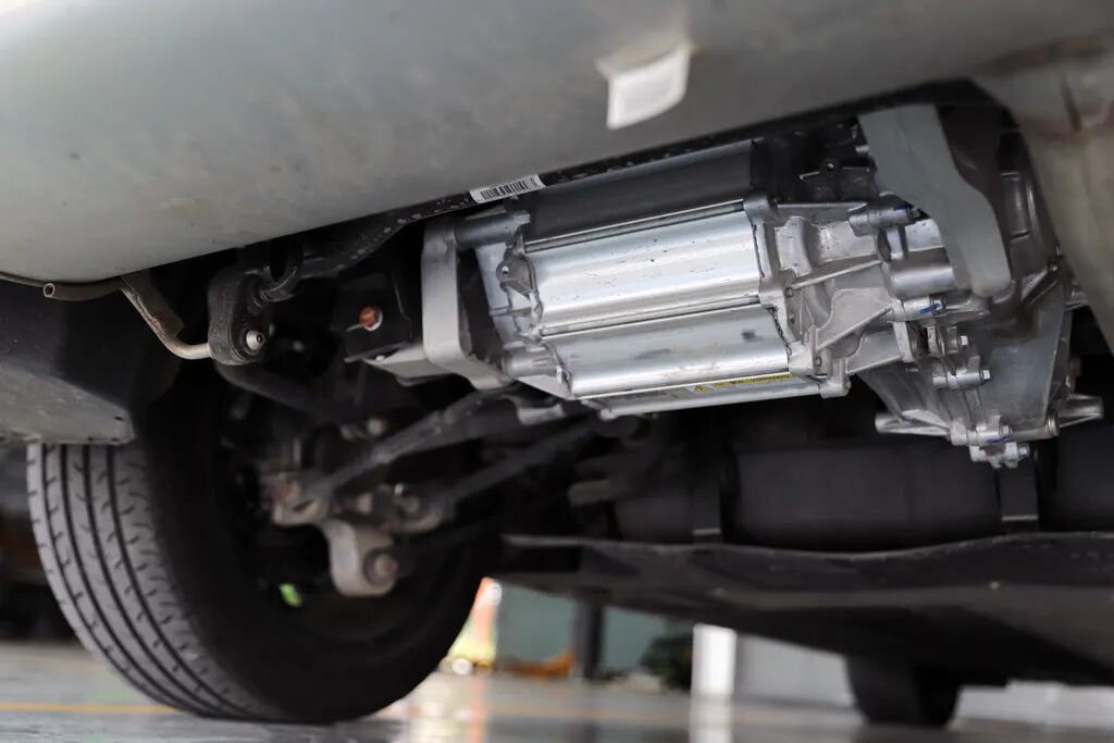 汉DM的驱动电机布置于后桥,负责驱动后轮,前轮主要由发动机+双离合变速箱驱动。