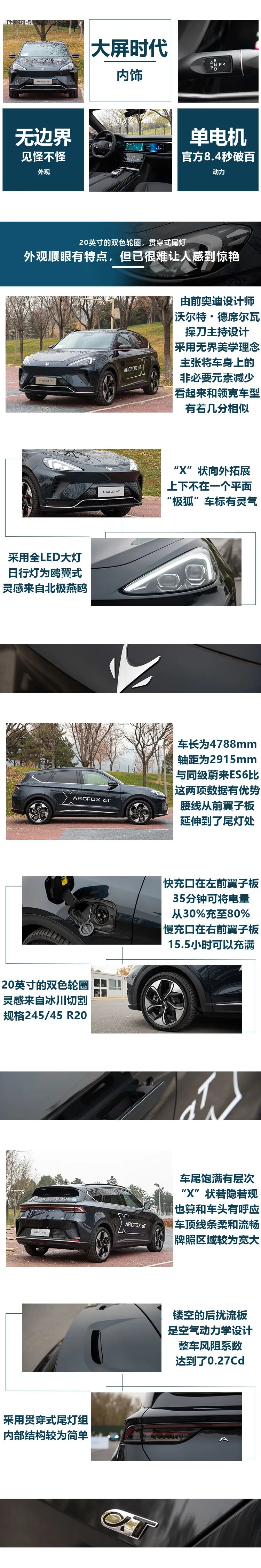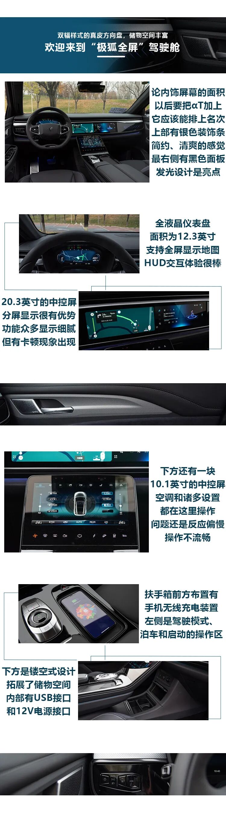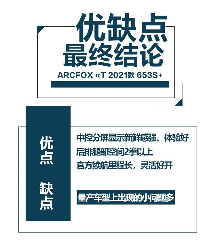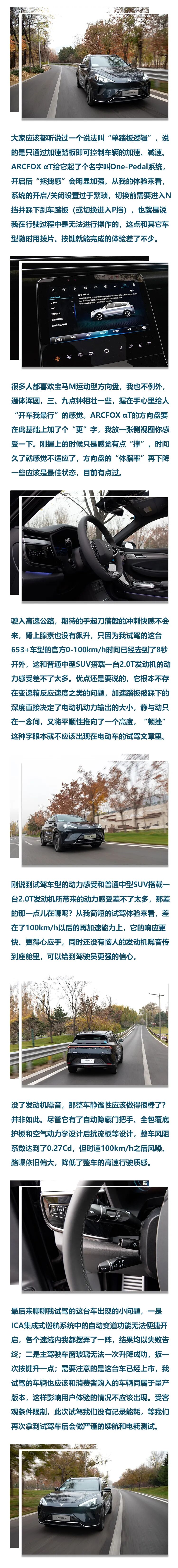 ARCFOX αT的官方续航里程达到了653km,在纯电动中型SUV里拿了个第一名,这个名片锃锃亮,确实是硬实力的体现。同时它还灵活好开,高速再加速能力强,驾驶感受较许多普通燃油中型SUV属于有过之而无不及。我一直想把它的三块大屏说成“四块大屏”,分屏的实际效果也的确和四块屏幕无差,这种“全屏”体验也许会成为一个五年的风向标。后排空间、配置则是无硬伤的表现。