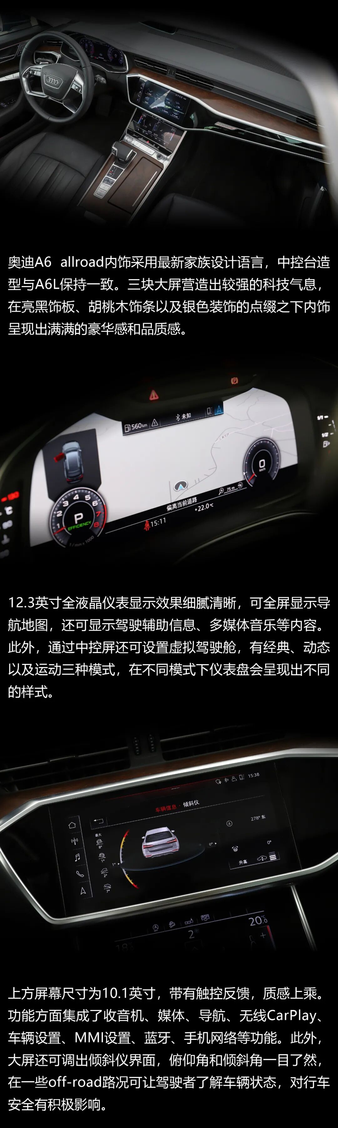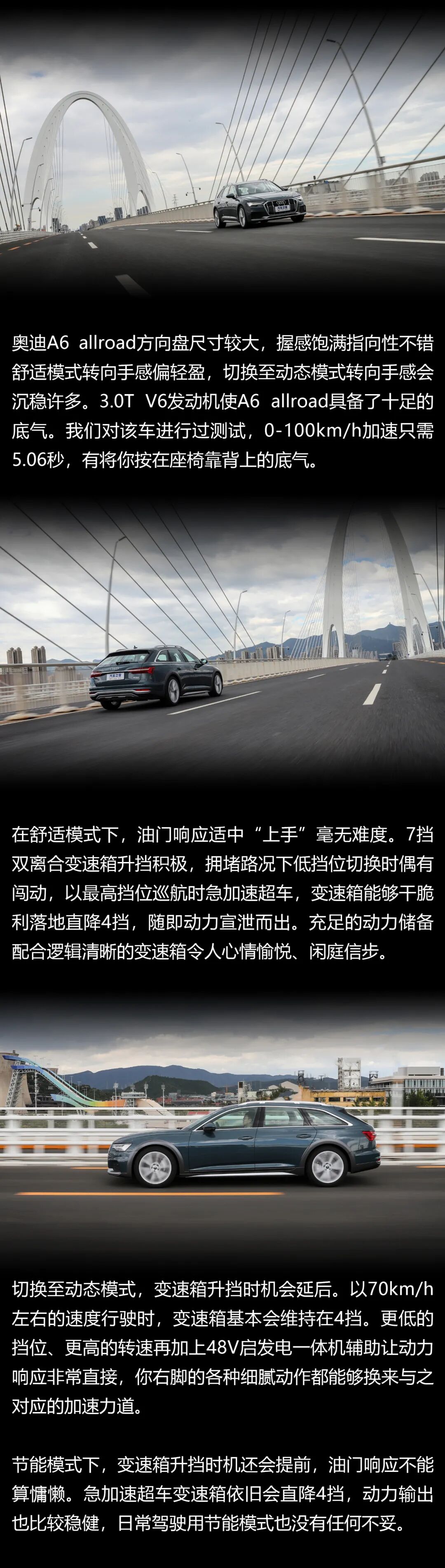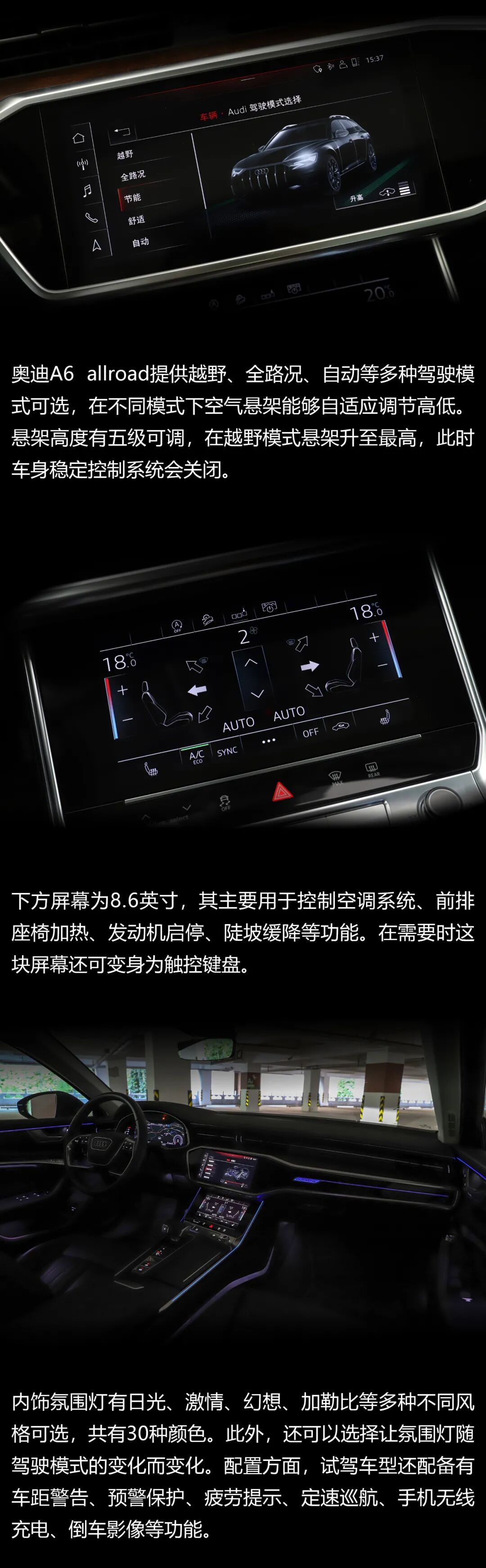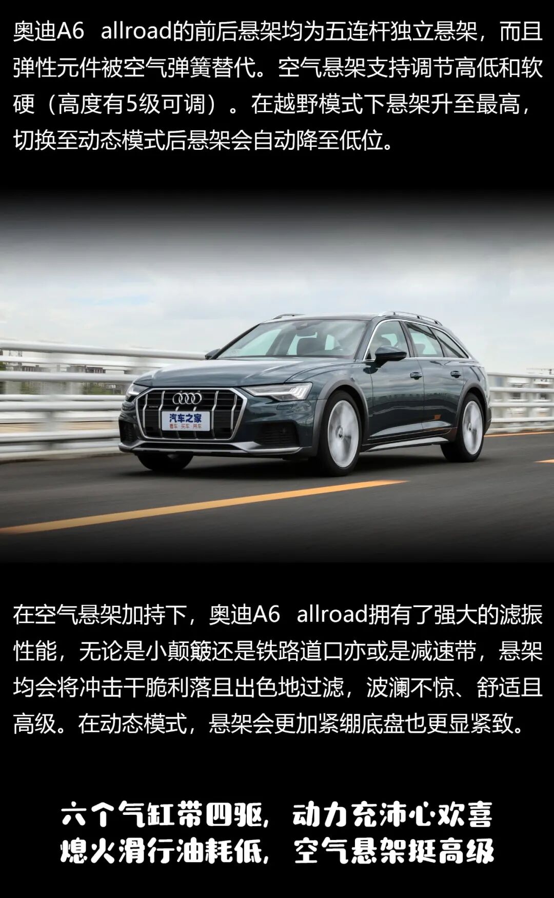 有3.0T V6发动机、空气悬架以及quattro ultra四驱系统的加持,A6 allroad具备了强大的机械素养,再加上出色的外观内饰设计以及旅行车具备的超大后备厢,使得A6 allroad展现出迷人的魅力。不过需要注意的是A6 allroad需要选装自适应巡航、车道偏离警告、平视显示系统、全景影像等功能。