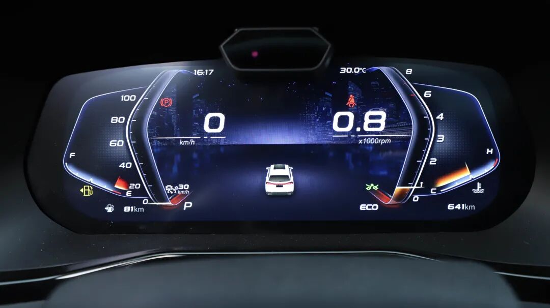10.25英寸的全液晶仪表显示效果以及功能性都是主流水准,上方配备的人脸智控系统可以实时监测驾驶员状态,从而实现关怀提醒及疲劳休息指引。举个例子,当系统监测到驾驶员有打哈欠的情况时,会主动询问是否需要讲个笑话放松一下,这种人机沟通的体验感十分人性化。