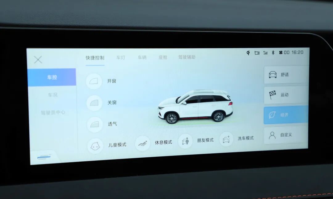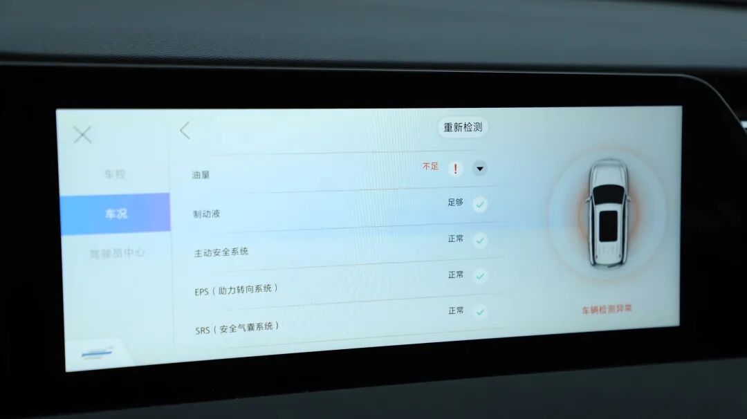 车况自动检测是我很喜欢的一项功能,就和电脑的查毒、自检功能一样,该功能也能对车辆的当前状况进行自动检查,问题项会以列表的形式展现出来,对于新手而言十分友好。车控界面还支持其他项目选择,包括驾驶模式以及车内氛围,使用起来非常便利。