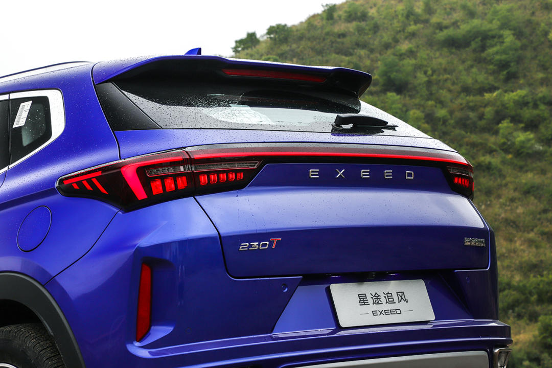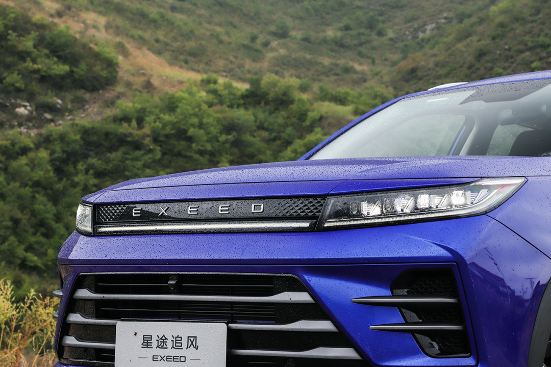 黑色饰板与两侧大灯相连,正中印有“EXEED”品牌标识,提升了整体感。矩阵式LED大灯为全系标配,搭配贯穿式LED灯带,点亮后的视觉效果出众。配置方面,中高配车型将配备自动大灯、大灯高度可调等功能,自适应远近光则为顶配车型专属。