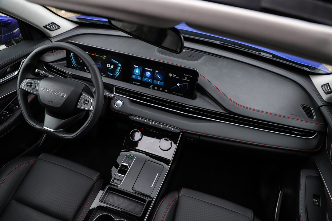 内饰座舱给人不错的质感,中控台覆盖大面积软性材质,用料很厚道,黑色钢琴烤漆面板让档次感进一步升华,美中不足的是容易沾染灰尘。双联屏布局虽屡见不鲜,但不得不承认,用它来提升车厢内的豪华感、科技感是十分有效的。