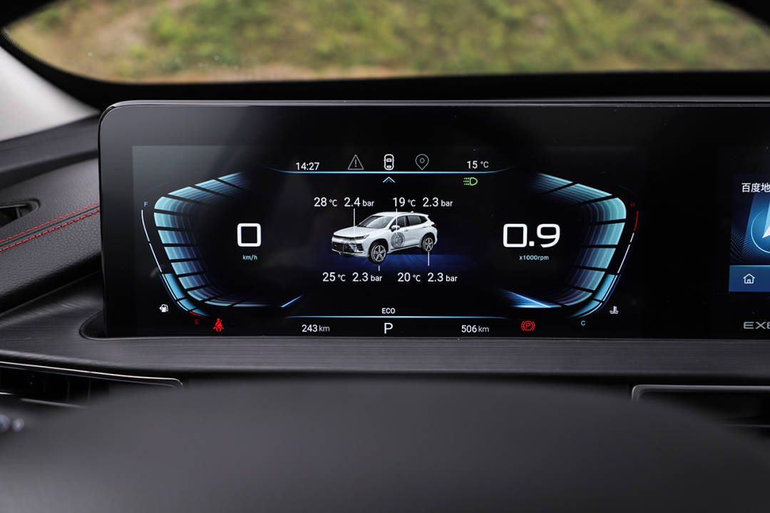 方向盘支持四向调节,使用真皮面料包裹,触感细腻,盘辐粗壮,握感饱满。全液晶仪表盘和中控屏的尺寸均为12.3英寸,显示效果清晰,且提供多种主题切换。