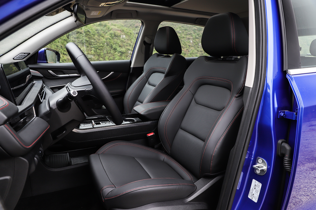 座椅面料使用大量红色缝线点缀,内部填充物较为柔软,有不错的贴合感。配置方面,主驾驶座支持6向电动调节,副驾驶座支持4向电动调节。