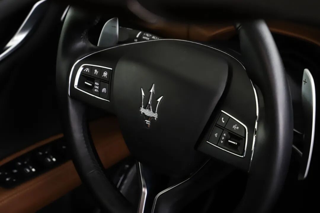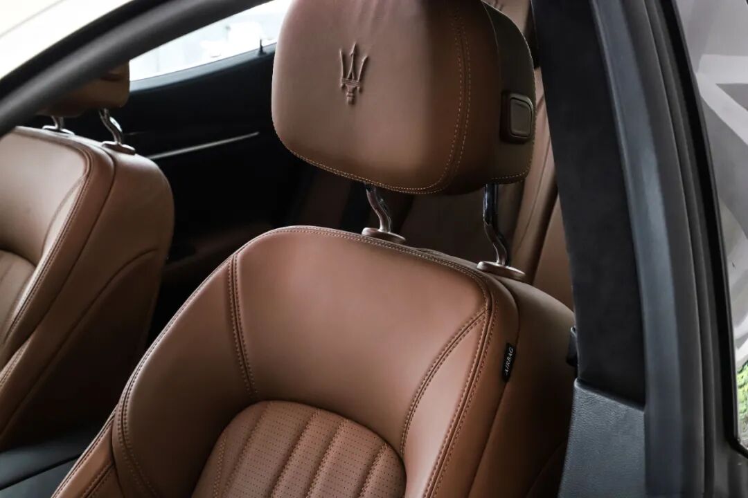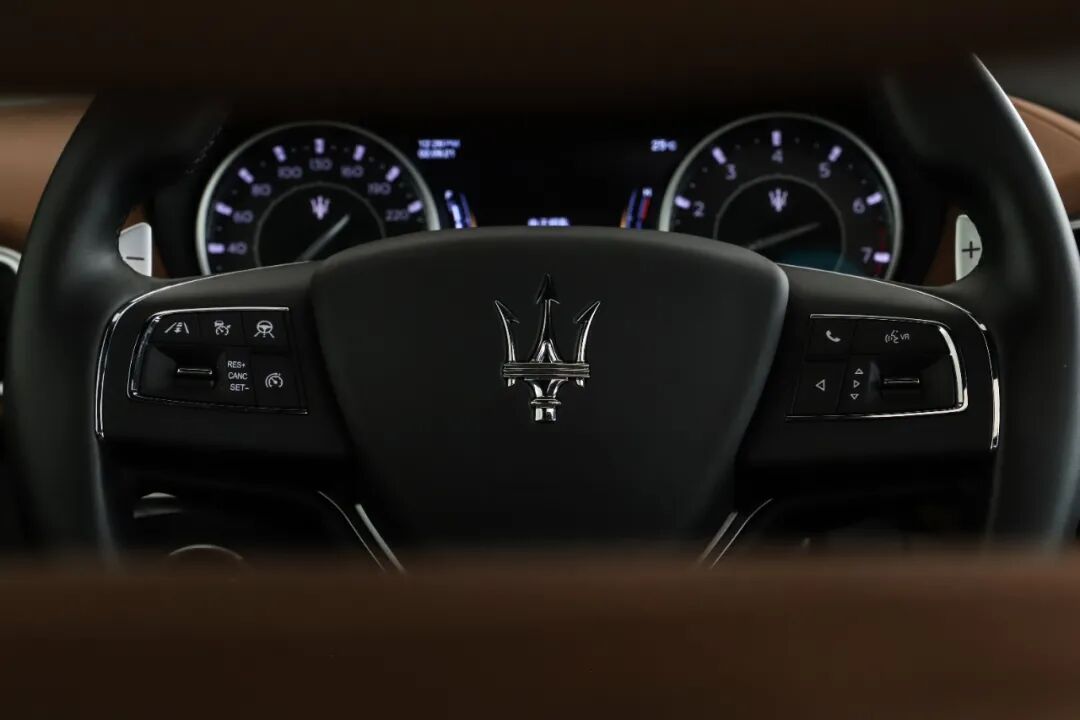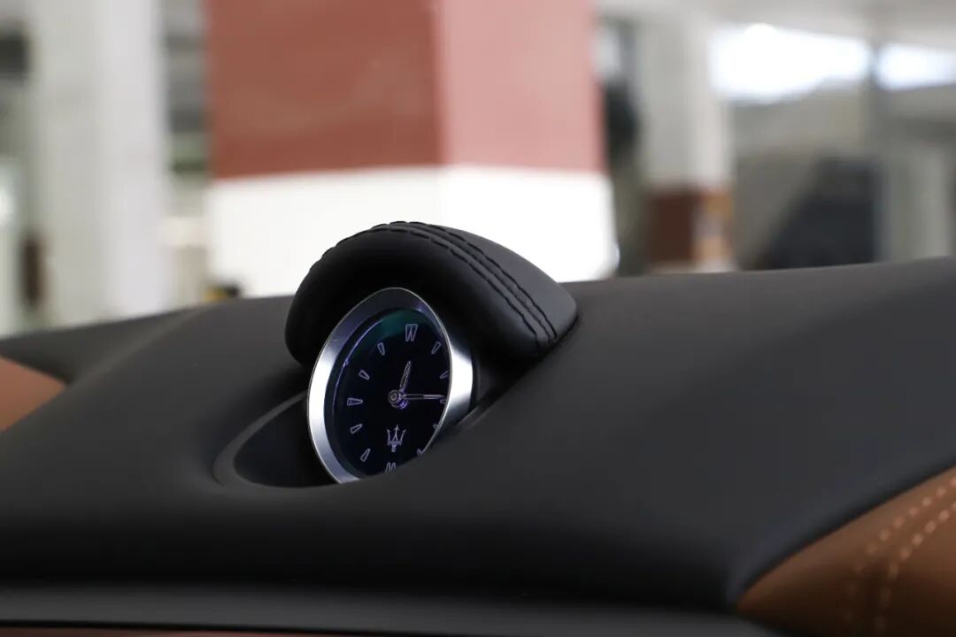 三叉戟标识浮现于眼前,即便方向盘样式多年未变,但依旧经典。硕大的换挡拨片并不随着方向盘转动,点火开关被设置在了左侧,这些都是传承赛车的设计,这样的坚持对于玛莎拉蒂来说,十分必要。