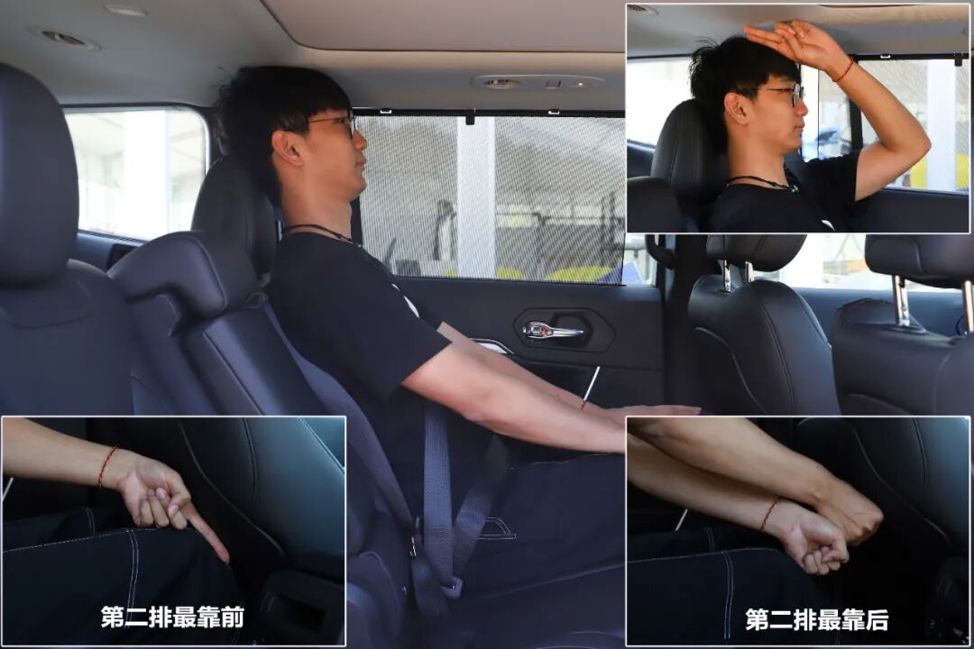 保持前排位置不变,同一体验者来到第二排,将座椅调至最靠前,此时的腿部空间为一指左右;而将座椅调至最靠后的状态下,即便是身高191cm的体验者,腿部空间也能达到两拳左右,相当的充裕。