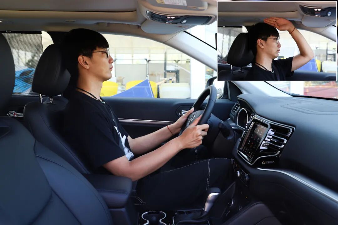 身高191cm的体验者进入前排,并将座椅位置调至最低,此时的头部空间为四指左右。由于体验者身高较高,相信对于绝大部分消费来说,头部空间绝对够用。