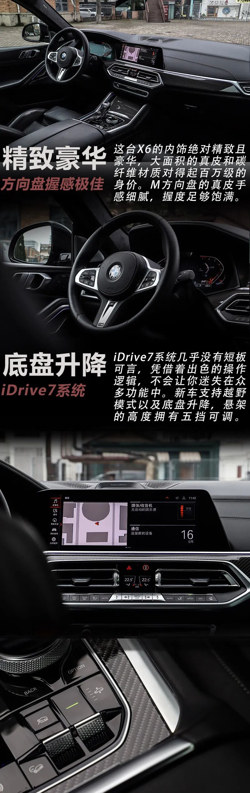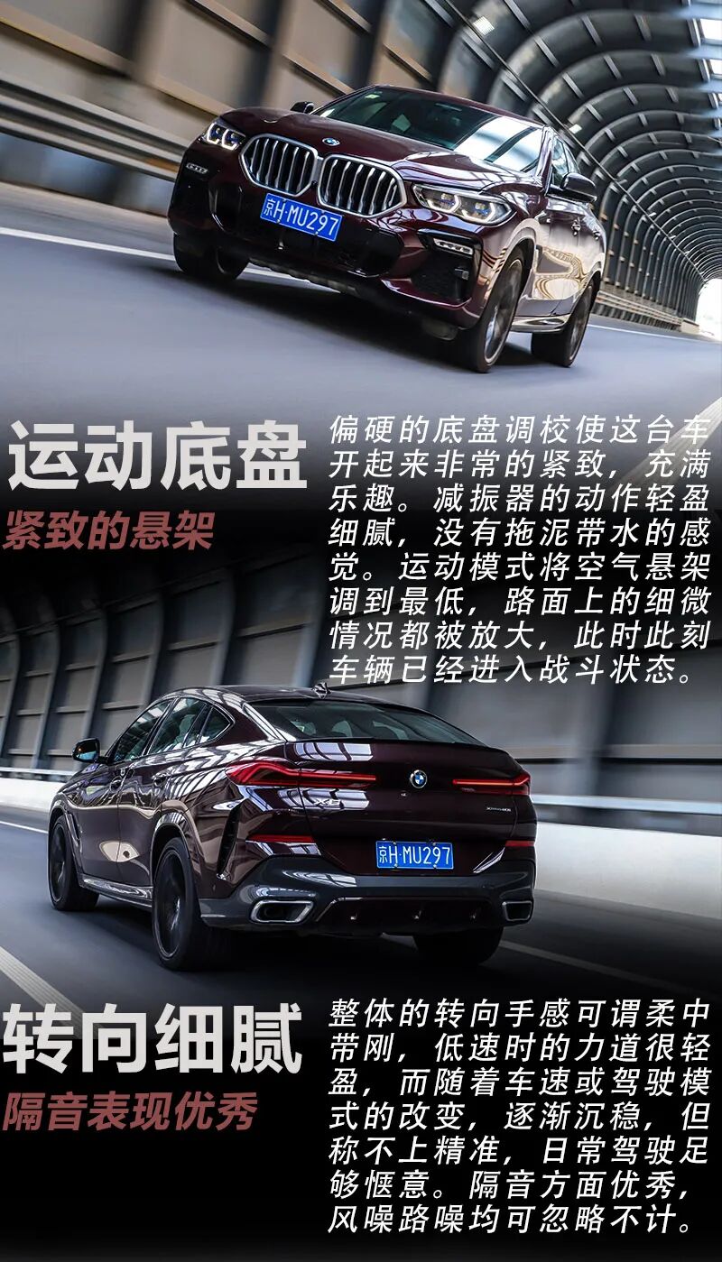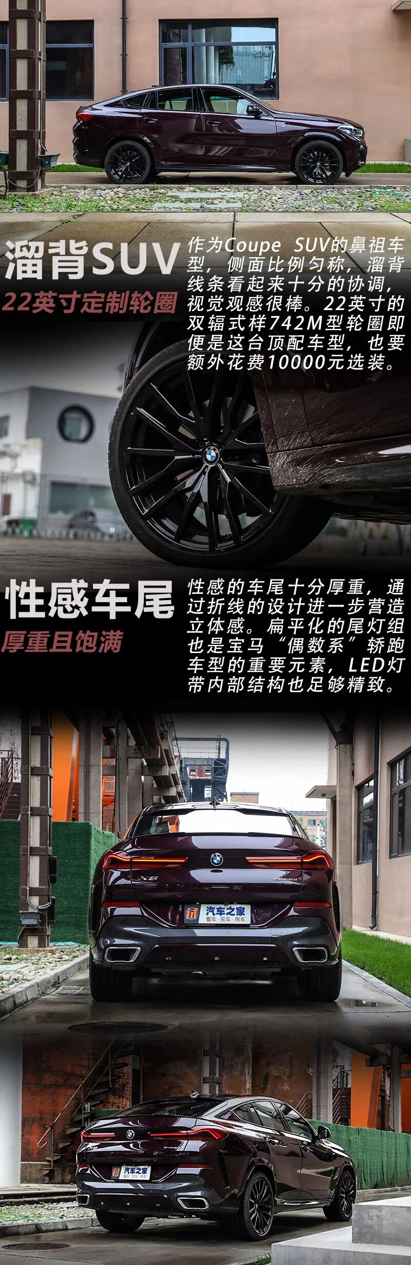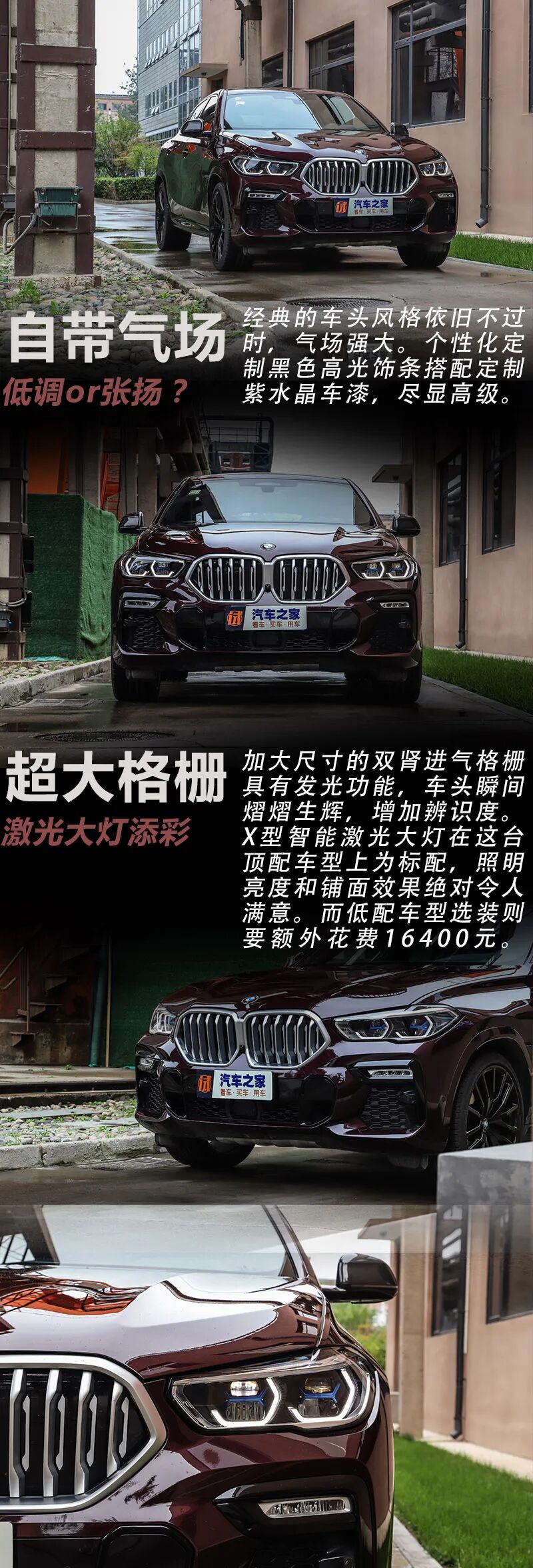 这台宝马X6是家族中的第三代车型,相比前两代车型可谓是取其精华去其糟粕,综合实力相当强大。可以说X5车型与X6车型的车主有着完全不同的人设或者生活方式,前者追求稳扎稳打,以实用性为主的理念;而后者更愿意去解锁个性化的需求,也更加享受着驾驶这台X6车型走街串巷时,路边行人所给予的注目礼。作为Coupe造型SUV的开创者,X6车型将实用性与个性化结合的惟妙惟肖,同时在公路性能上大显身手。纵使同级竞品推出了类似的车型来抢占市场,但似乎在不少车迷心中Coupe造型的SUV却只有这台自巴伐利亚出品的BMW X6。
