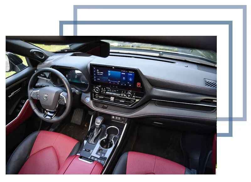 12.3英寸悬浮式屏幕采用异形设计,看上去更加个性,车机系统支持语音控制、在线音乐、导航等功能,实用性能够得到保障,全景影像功能对于这样一台大家伙是非常实用的,并且画面的畸变控制的也比较理想。