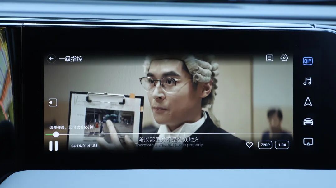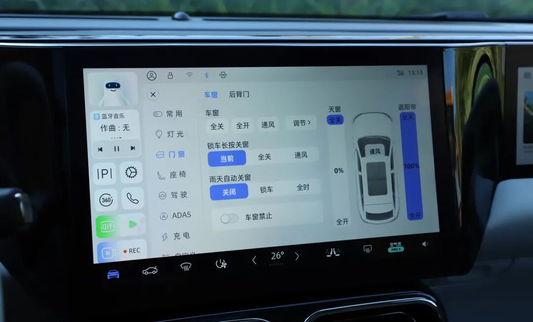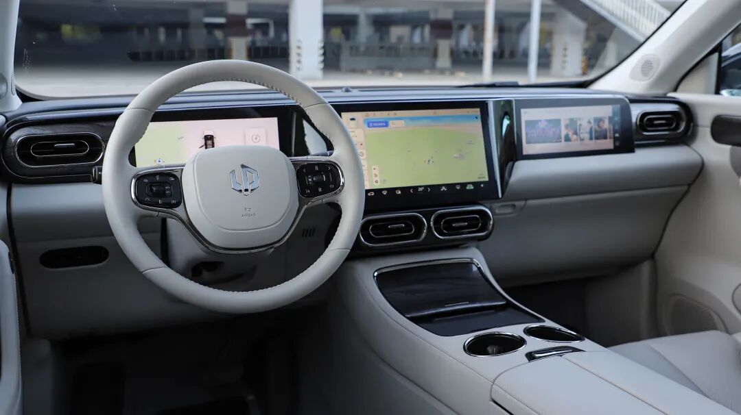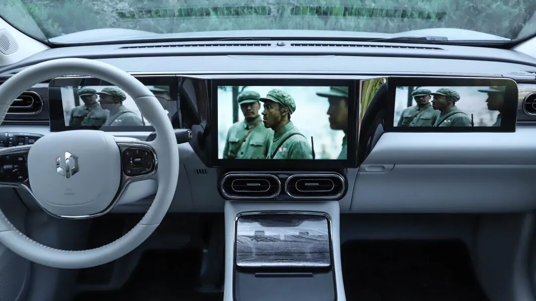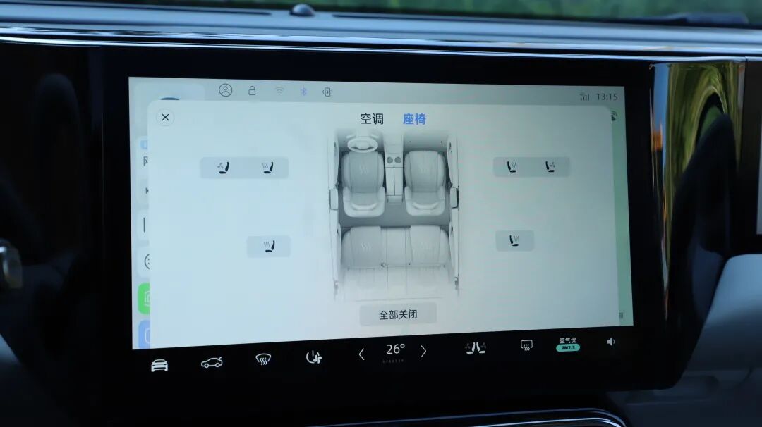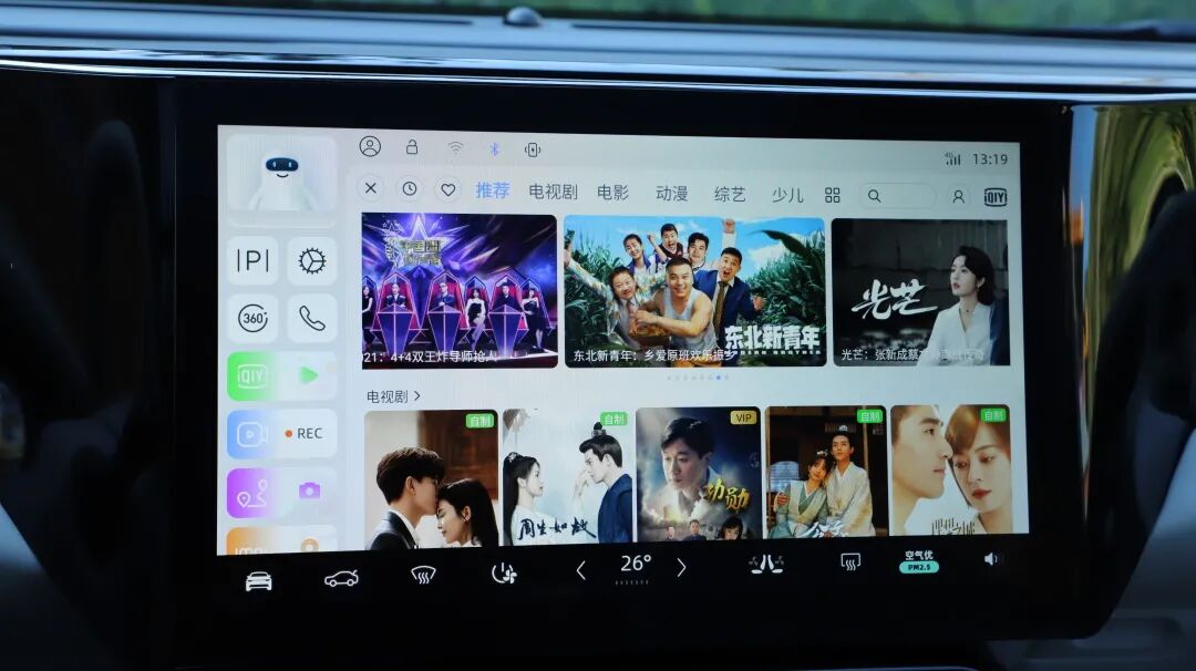横贯中控区域的沉浸式三联屏是最大看点,10.25英寸+12.8英寸+10.25英寸三块大屏可实现三屏影院模式以及双音区独立交互(支持双ID和双音区,主副驾可以收听自己喜欢的音乐,而且都能享受到AI学习之后的个性化内容推送),同时中控屏和副驾屏支持双向飞屏,短暂延迟后即可实现屏幕切换。不过需要注意的是,进入三屏影院模式之后,左右两侧的画面尺寸会被横向拉伸,飞屏的话则不受影响。