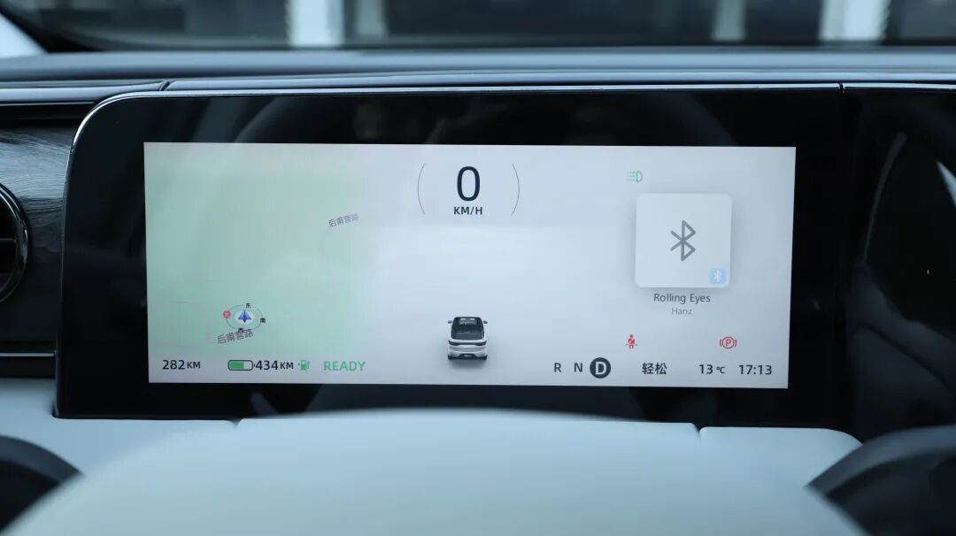 轻松驾驶模式下的动能回收力度还是比较轻柔的,而在运动模式下,动能回收力度会明显增强,会和轻踩下刹车踏板的感受类似,这种类似单踏板模式的调校在部分路况下可以省去踩刹车的环节,也比较易于上手。同时,车辆的电门踏板响应会灵敏很多,尤其在踩踏一半行程之后,加速会来得更快,推背感也更加明显。