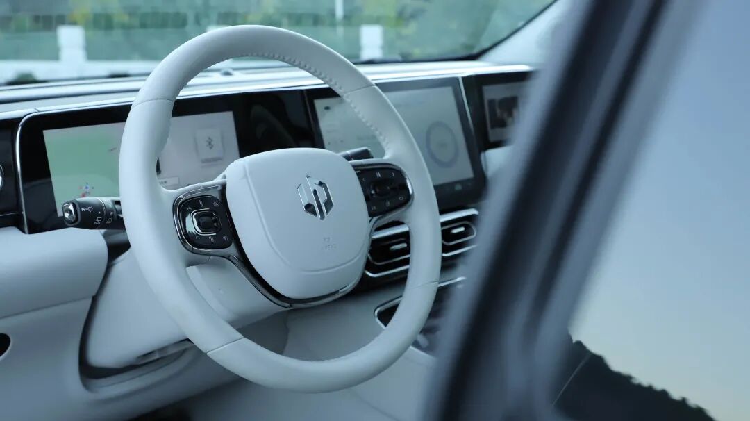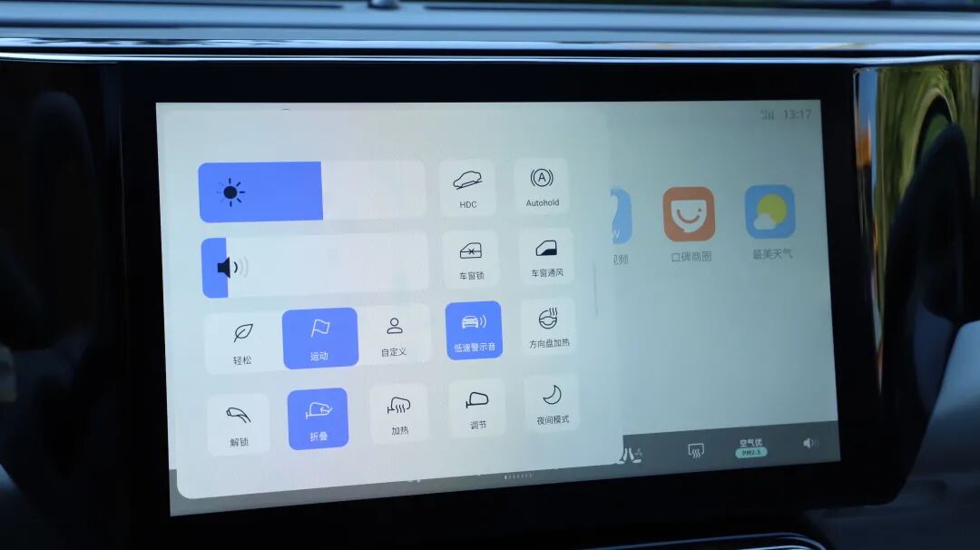 在中控区域,您看不到什么实体按键,几乎所有功能都被整合到了这块12.8英寸的大屏幕中,其内置第三代高通骁龙8155数字座舱芯片以及8核处理器,性能算力为上一代的3倍。功能方面,车窗控制、座椅控制、主被动安全以及微信至车机的位置分享都包含在内,向右侧滑动还可呼出快捷菜单栏,快速切换驾驶模式、屏幕亮度等功能,如手机一般的使用体验让人颇有好感度。