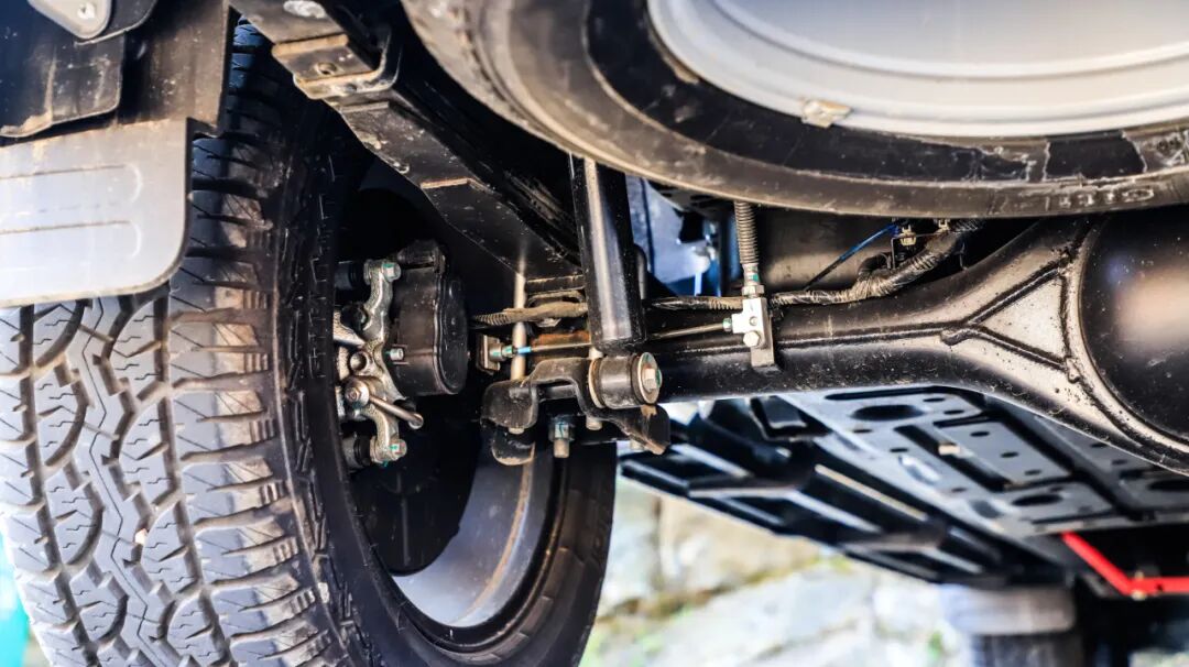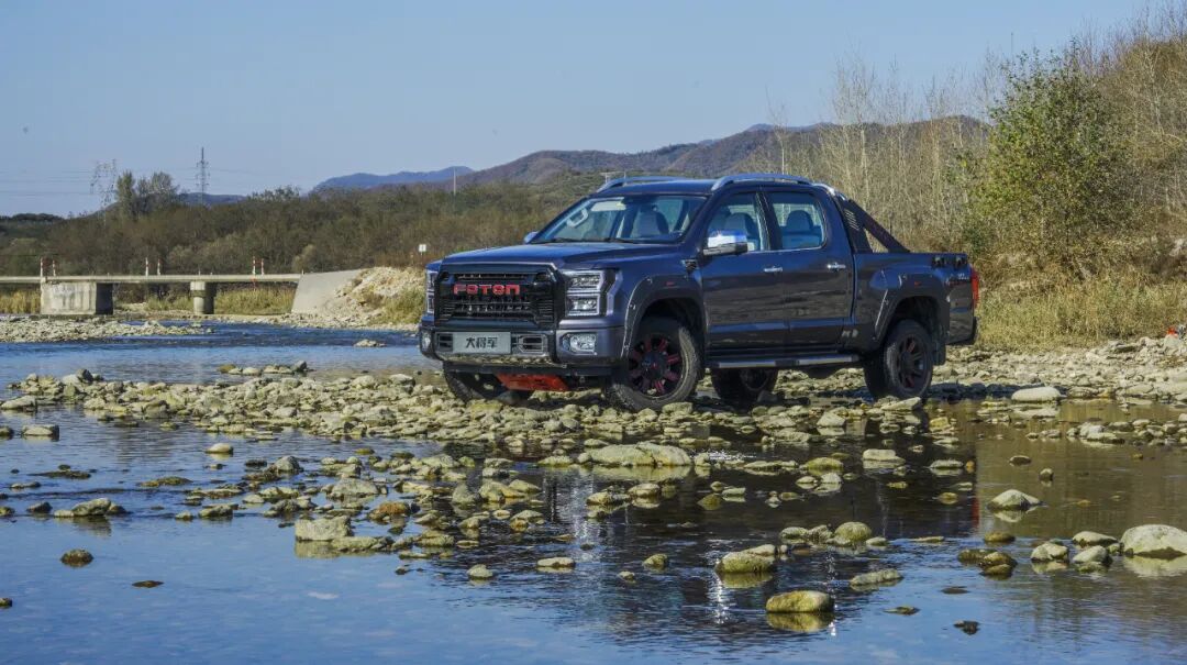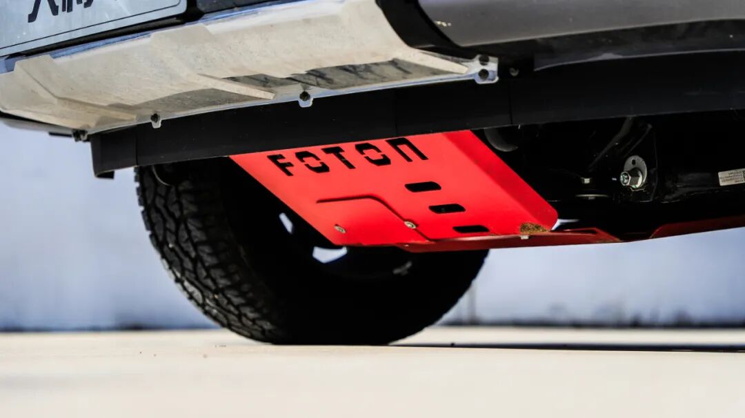 车身细节有非常明显的Offroad风格,包括佳通的AT胎,塑料材质的轮眉以及尺寸非常大(覆盖发动机和变速箱)的红色涂装下护板,很明显福田想把它打造成更具玩乐主义的大玩具。