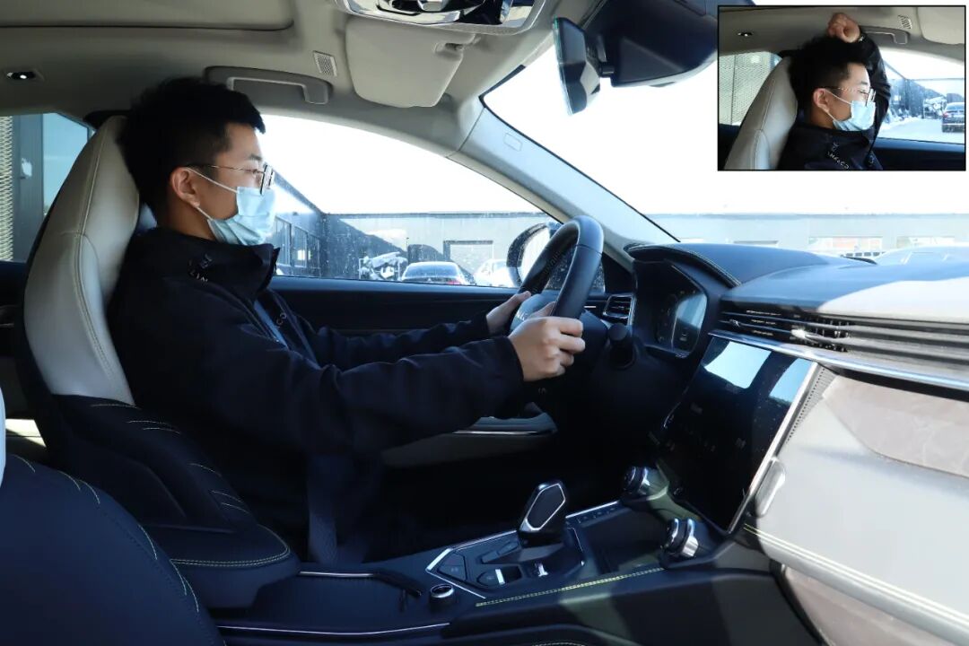 身高175cm的体验者进入前排,并将座椅位置调至最低,此时的头部空间为一拳左右,表现中规中矩。