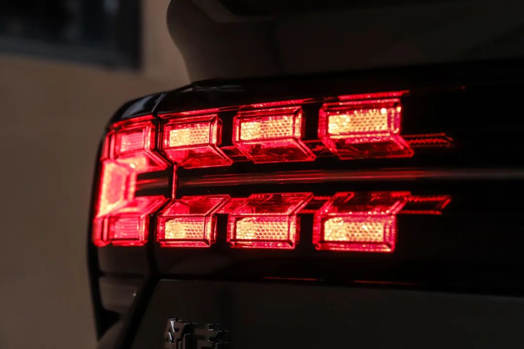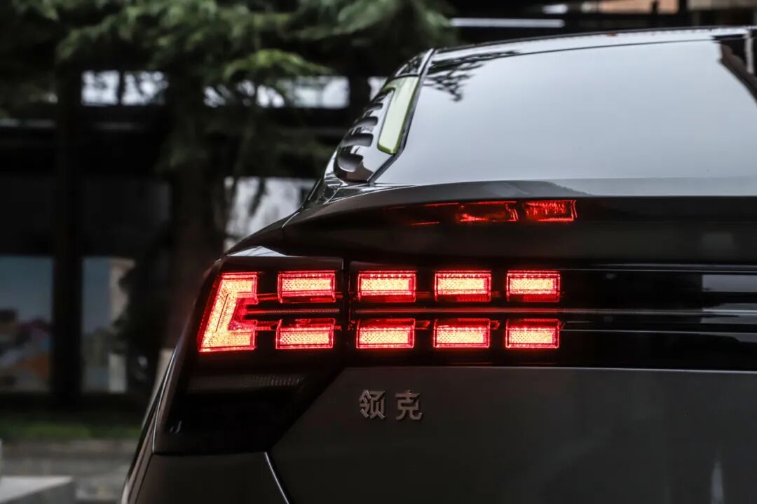 车尾造型丰满且厚重,最具特点的莫过于尾灯组了,内部由多个矩形组合而成,结构精致,点亮后的视觉效果相当吸睛。