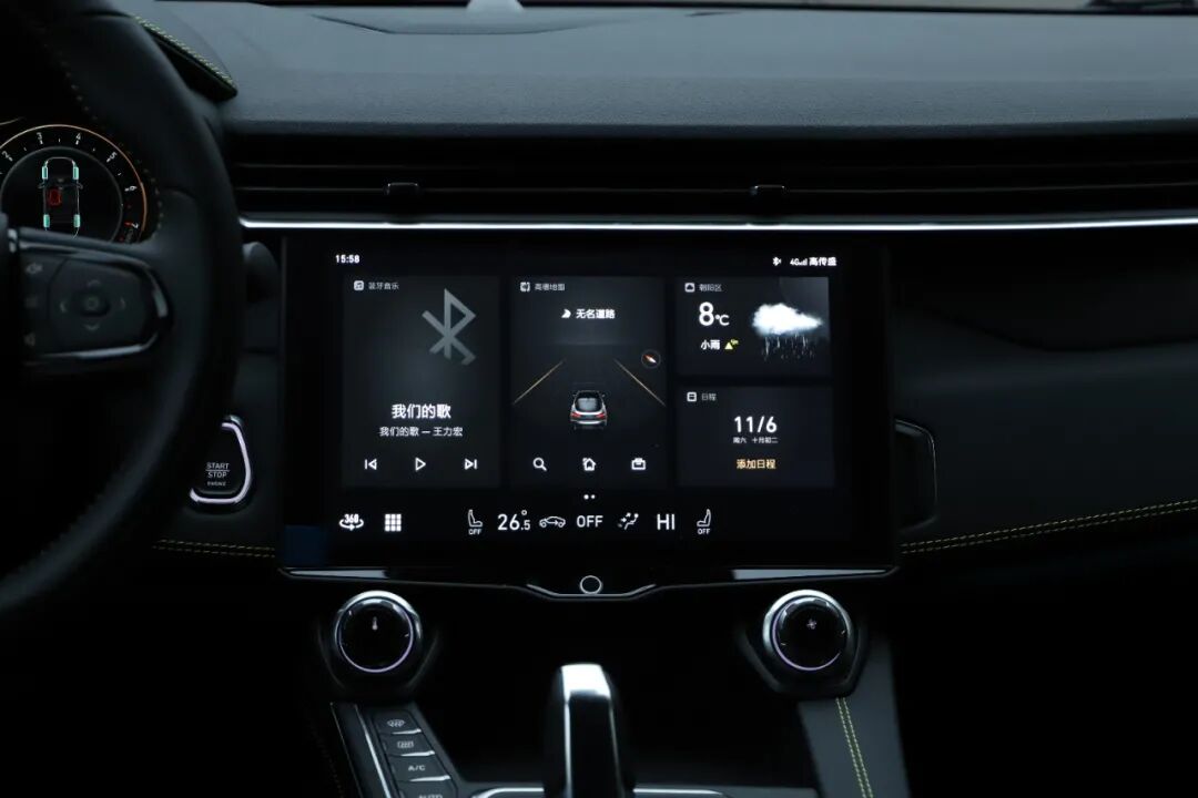 中控屏幕的尺寸为12.7英寸,同样为全系标配,实际使用起来没有卡顿的现象,车机系统搭载了高通骁龙820A处理器,运算速度更快。常用的导航、在线音乐、车辆网等功能自然没有缺席。另外,屏幕的下方还有一个“HOME键”,这个按键和手机的“HOME键”是完全一样的操作逻辑,可以一键返回主界面,也可以录入指纹,从而快速识别用户信息。