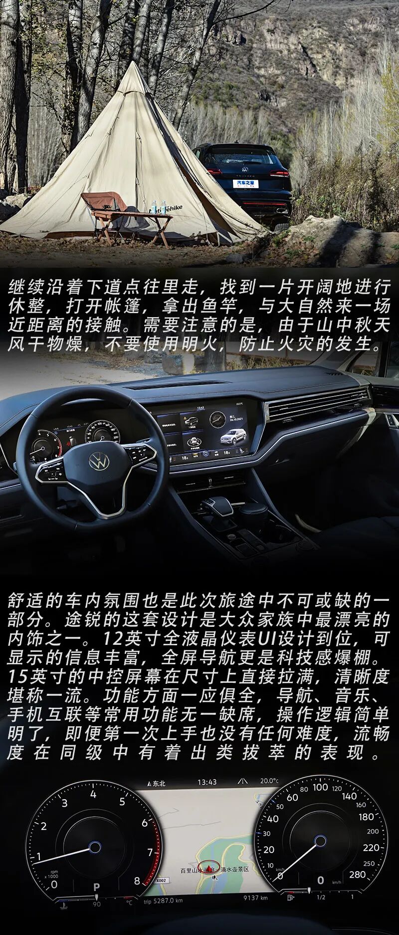 一场说走就走的旅行能够让你释放积存已久的压力,身体和灵魂必须有一个在路上。一台靠谱儿的车更是旅途中不可或缺的保障。这一次我们百里山水画廊之行,在途锐的陪伴下,顺利且有趣。可以说这台车能文能武,日常驾驶超高的舒适性、强悍的四驱能力以及优秀的底盘质感给我留下了极为深刻的印象。我们此次的试驾车型为大众途锐2021款 2.0TSI 锐尚版,指导价62.98万元。怎么样,您愿意将这台车纳入囊中吗?请在评论区给我留言吧!