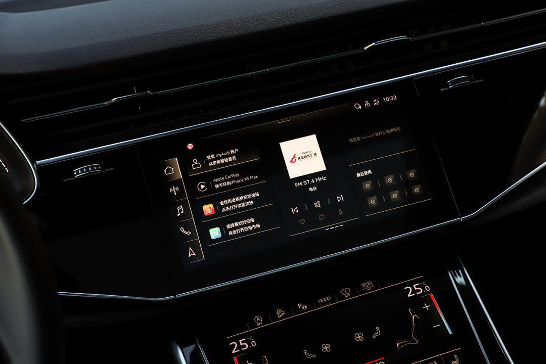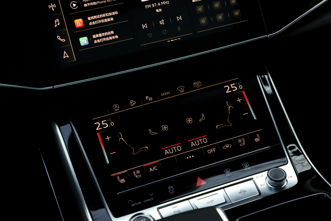 两块屏幕的操作流畅性极高,可实现精准的触控操作,使用时的便利性也不用担心,清脆的振动反馈颇具质感。上方的屏幕尺寸为10.1英寸,且搭载最新的MMI系统,导航、语音识别、车联网、无线CarPlay等功能一应俱全;下方的屏幕尺寸为8.6英寸,主要负责调节车辆空调、座椅加热等车辆功能。