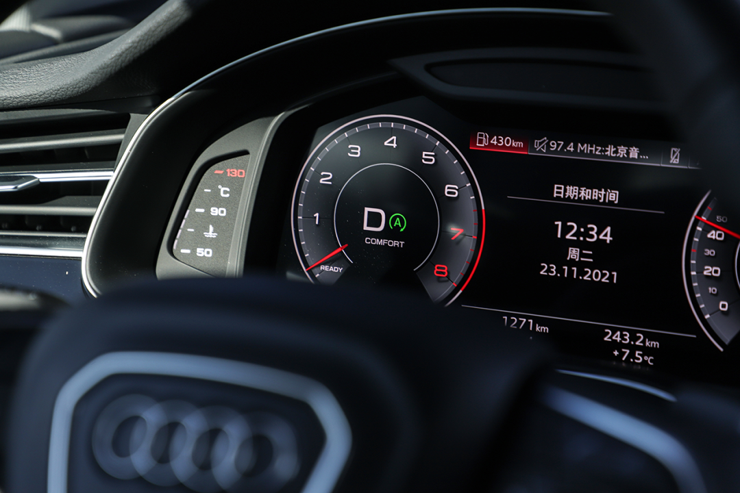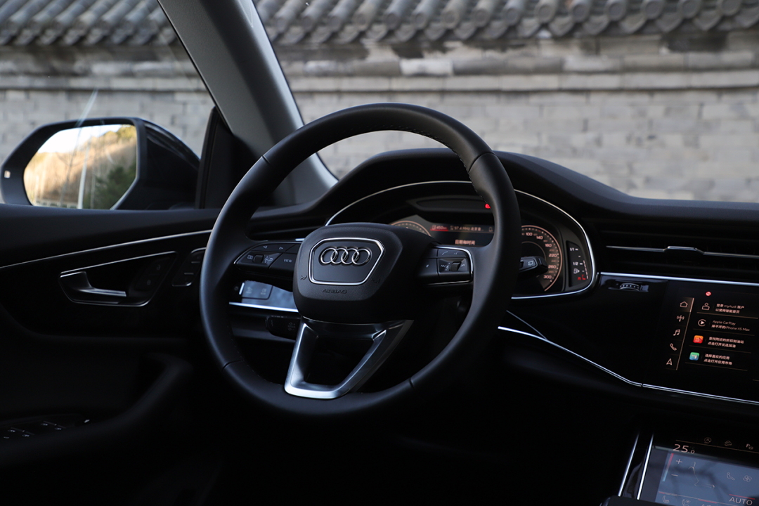 方向盘采用真皮材质包裹,皮质顺滑,但内部少了填充,握感偏硬。在这辆55 TFSI 豪华动感型上,方向盘加热以及电动调节这两项配置均需要选装,价格分别为3200元和5900元。