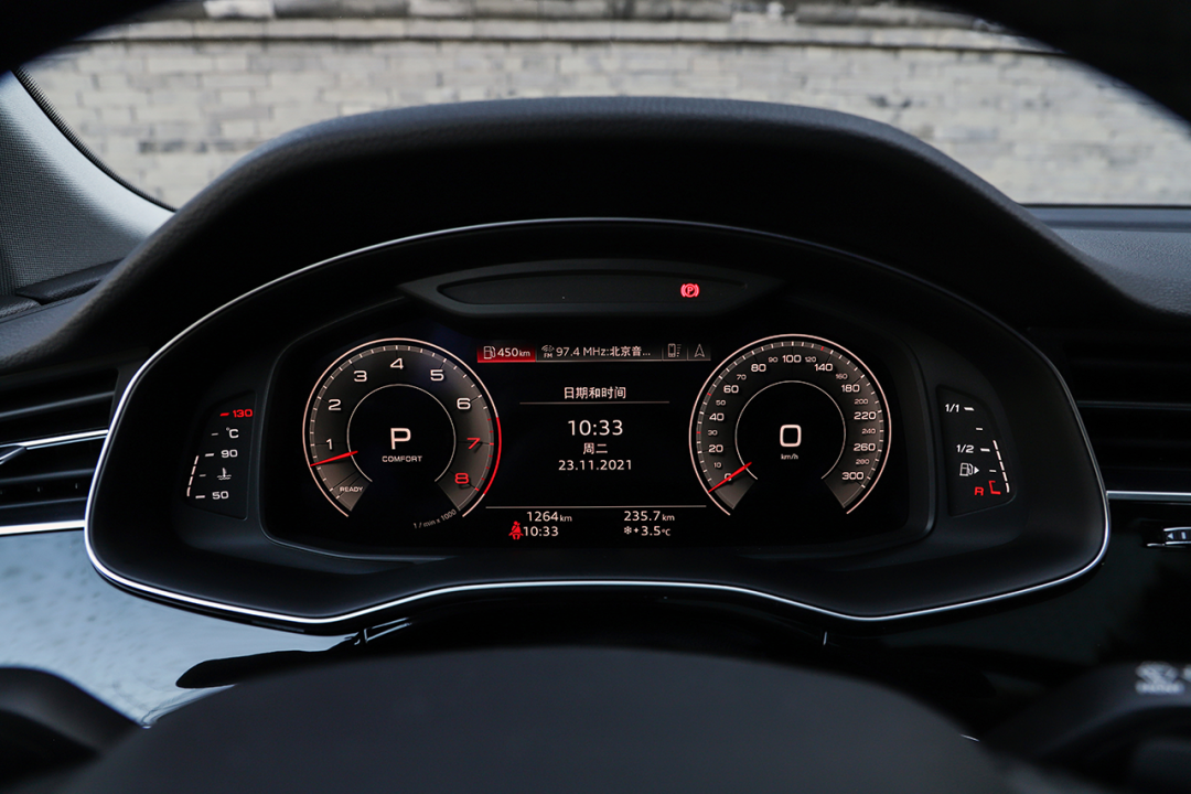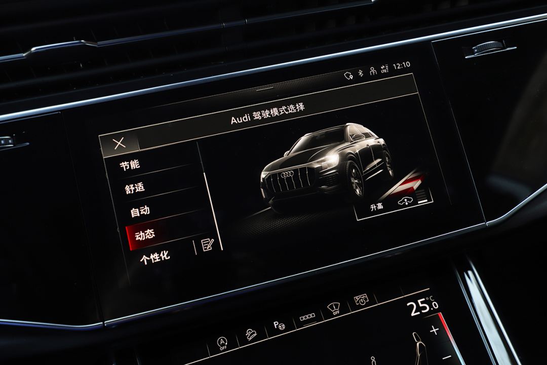 在舒适和动态模式下,这辆奥迪Q8呈现出不同的性格。舒适模式下,动力输出循序渐进,轻盈的转向力度让日常代步更为轻松,空气悬架将车身高度保持在适中的位置,提升悬架行程并带来更好的驾驶视野,路面上的大小颠簸被柔和化解,悬架的厚重感表现符合百万级SUV的水准,相比奥迪Q5L等车型明显提升。