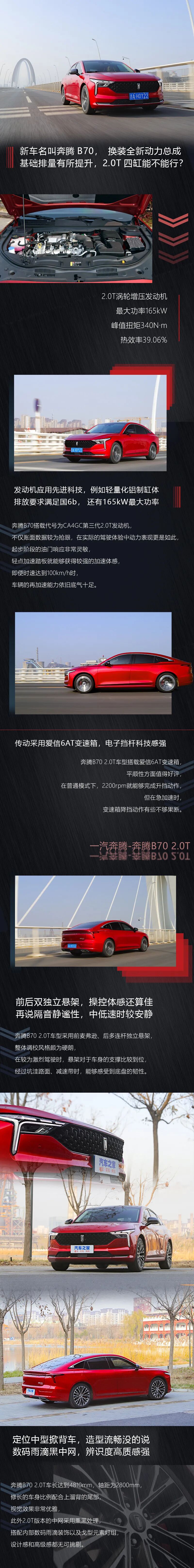 中国元素、中型车、溜背造型,这些鲜明的元素融合到一起便是我们今天的主角奔腾B70,不得不承认在造型设计上奔腾B70在中国品牌车型中绝对称得上数一数二,但新车前期版本仅提供1.5T动力车型,对于一台中型车而言略显薄弱。就在不久前,一汽奔腾-奔腾B70 2.0T版本正式上市,售价区间13.59-14.59万元,作为一台顶配车型指导价格不过15万元的中型车,新车全新动力表现如何?