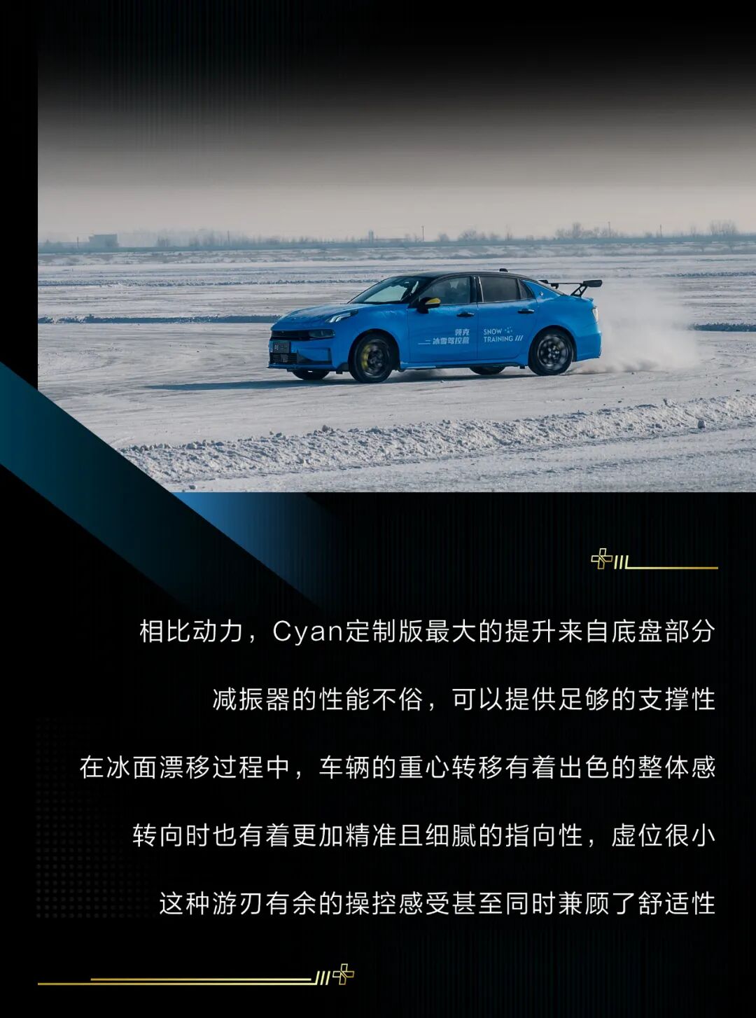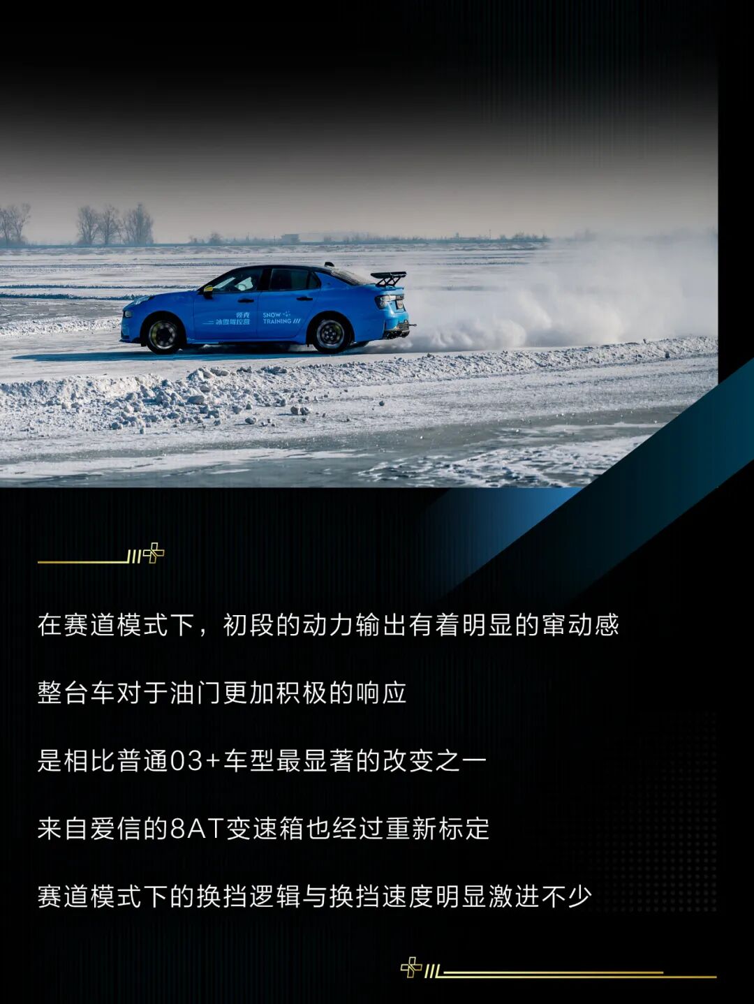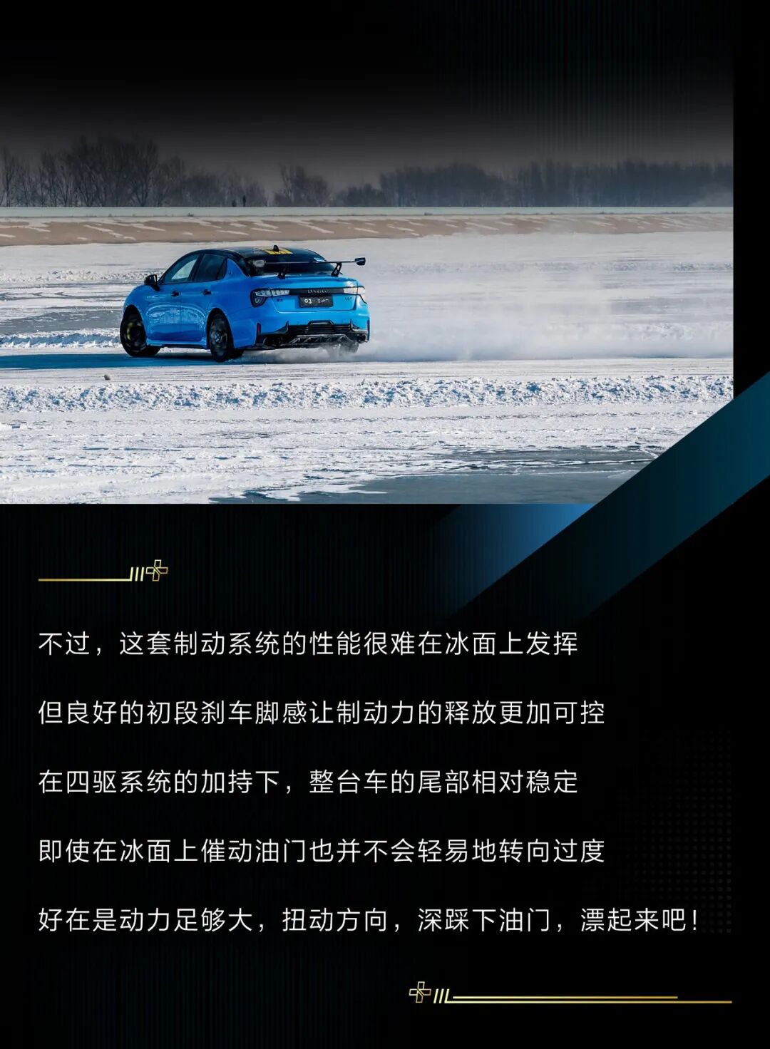 当然,今天的主角依然是这台领克03+ Cyan定制版,作为03+的高性能版车型,它的提升确实非常明显,激进的动力调校搭配四平八稳的操控感受,让驾驶者可以相对轻松地试探这台钢炮的极限,即使在冰面上车尾也不容易横滑。