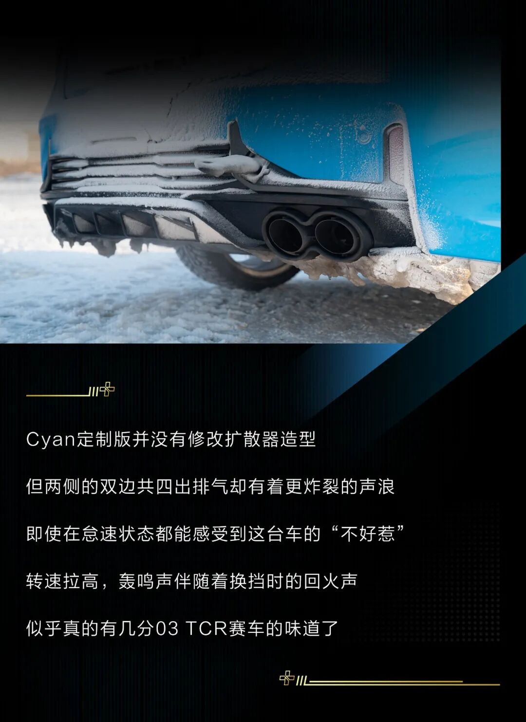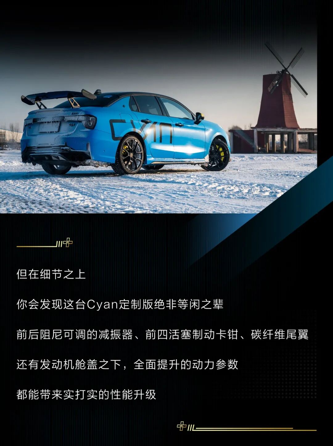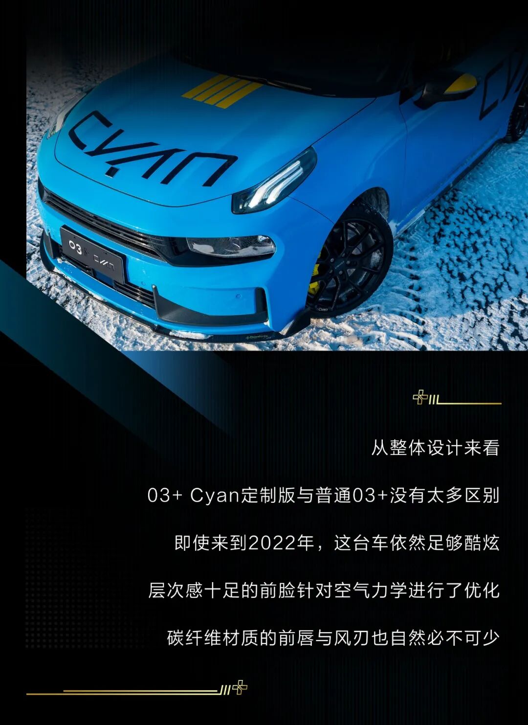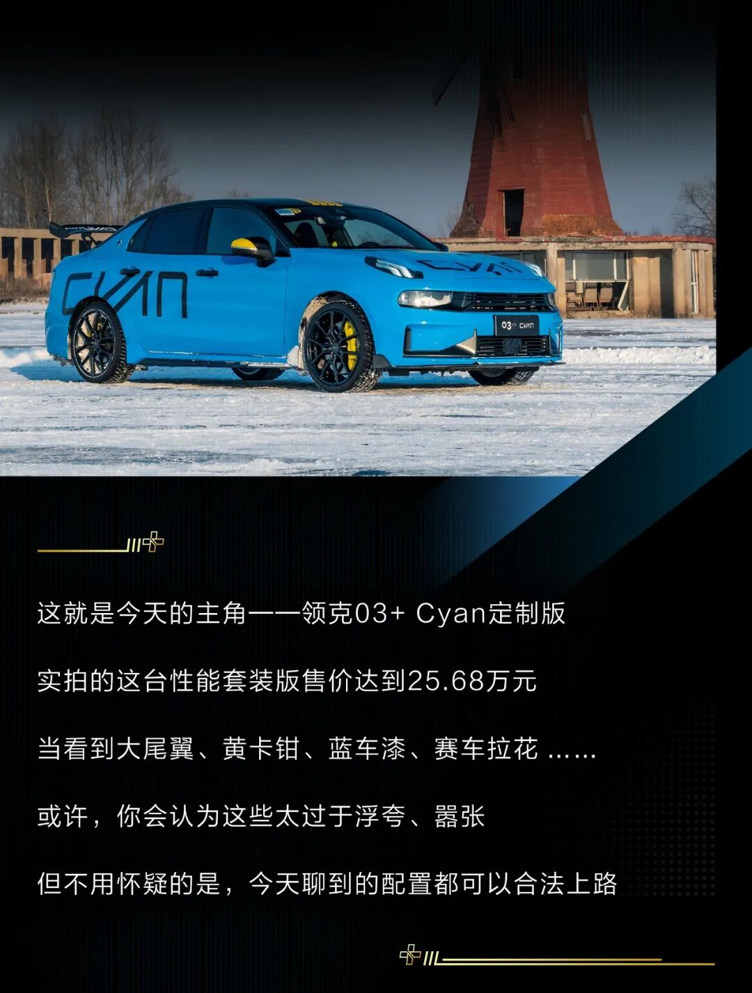 当然,今天的主角依然是这台领克03+ Cyan定制版,作为03+的高性能版车型,它的提升确实非常明显,激进的动力调校搭配四平八稳的操控感受,让驾驶者可以相对轻松地试探这台钢炮的极限,即使在冰面上车尾也不容易横滑。