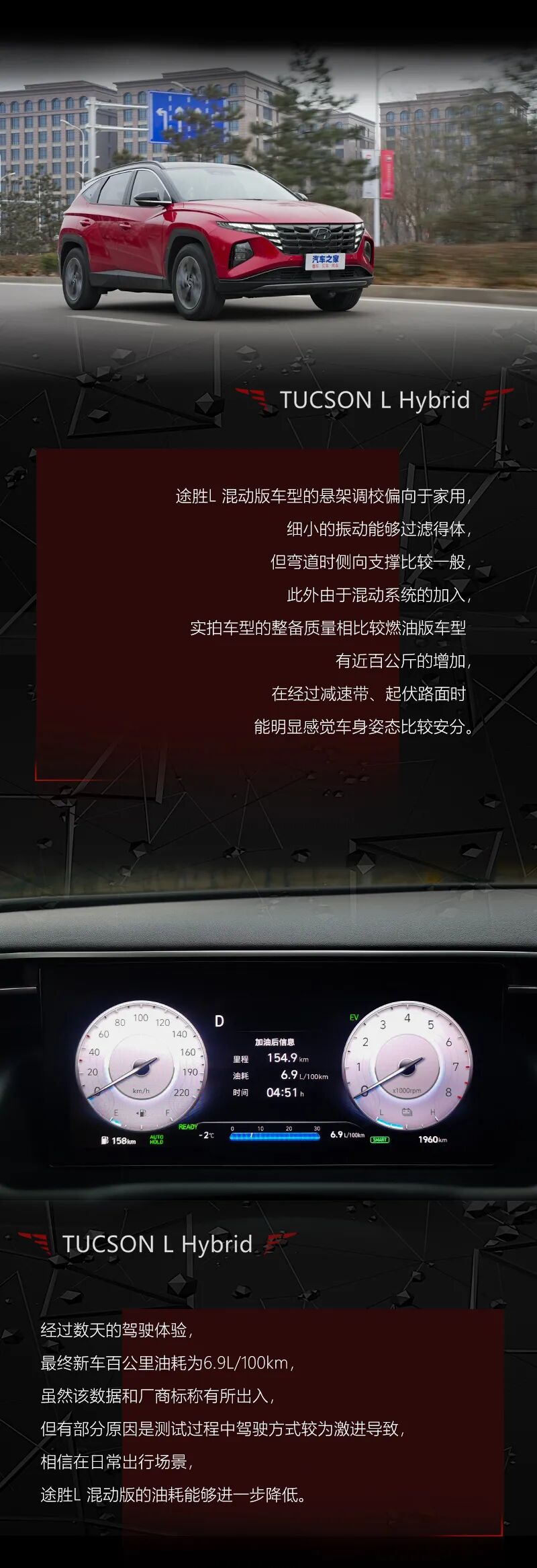 相比较CR-V、RAV4车型而言,途胜L 混动版18.58-22.58万元的售价区间明显要低了一部分,但不论是配置层面还是车身尺寸来说,新车表现都比较抢眼;在动态表现上,新车的混动逻辑和丰田THS比较相似,发动机既能够直驱也能够为电动机发电。在我们的驾驶中,由于测试原因经历了大量急加速、拥堵场景,但新车的表显综合油耗还能控制在7L/100km以下,着实给人不小惊喜。