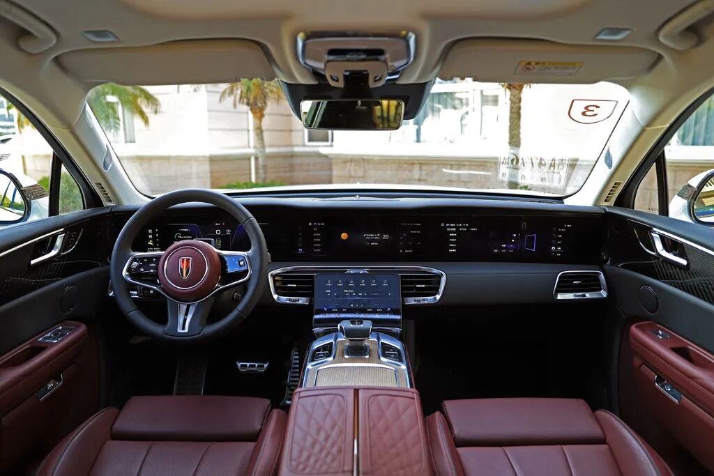 作为一台价位超过50万的中国品牌豪华SUV,E-HS9的内饰做工无需多言,内饰中不管是用料还是做工都很实在,软质包裹遍布全车各处,红色皮质材料与挡杆的木纹面板烘托浓郁的古典奢华气息。