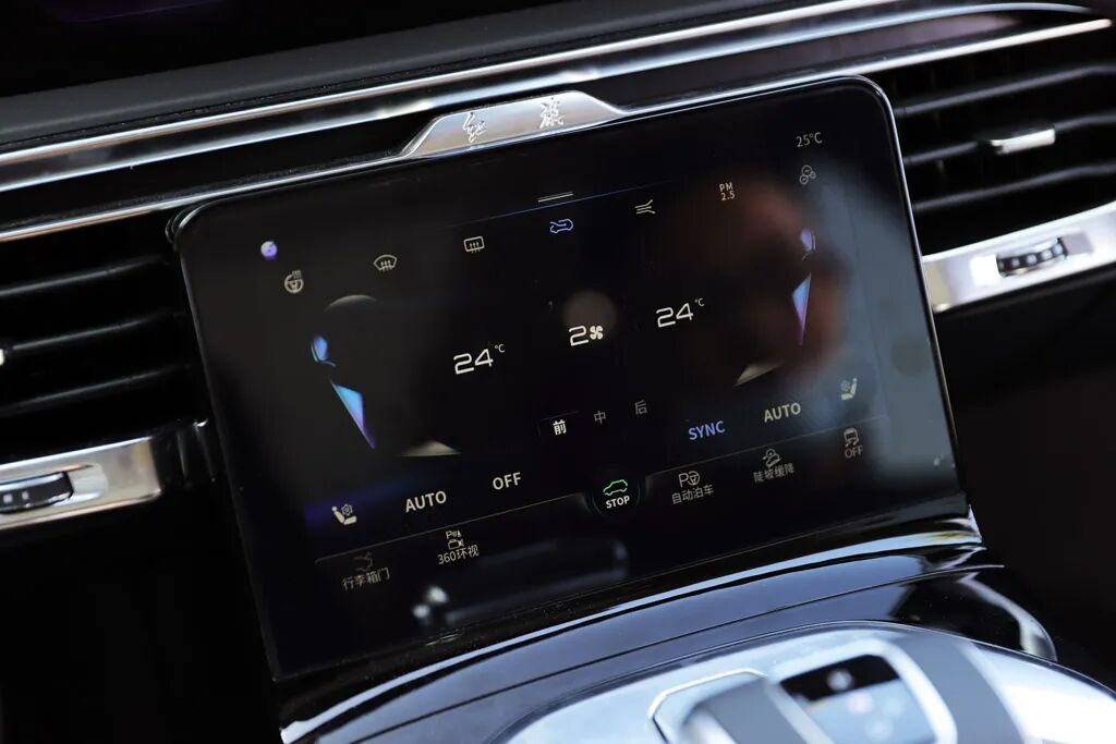 E-HS9中控台的一大特点是,取消了大部分实体按键,将空调、座椅调节、后备厢开启等功能都集成到了屏幕中,这样做虽然给操作带来了一些不方便,但要知道这台车舒适性配置非常丰富,布置太多按键很有可能会让内饰设计变得凌乱。